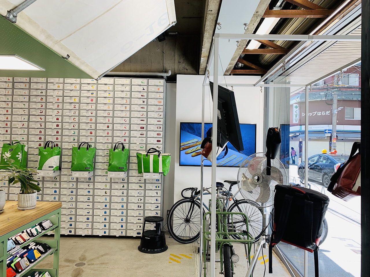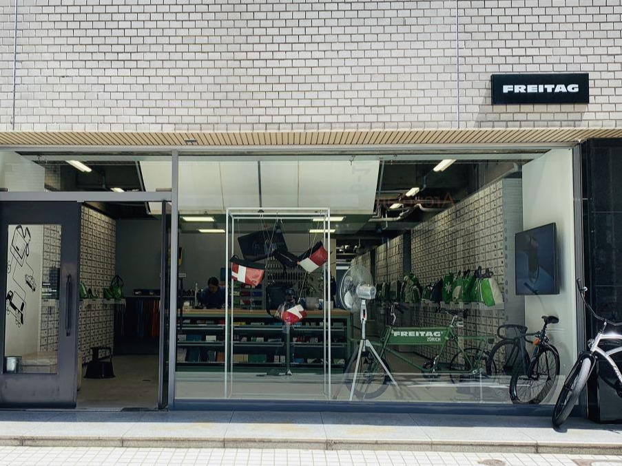 같은 맥락에서 매장의 입구는 통유리로 밖에서도 프라이탁의 모든 제품을 훤히 보이는 오픈된 입구를 보여주고 있고 자신들의 시작이었던 자전거를 타고 다녔던 시절을 기억하듯이 오래된 자전거가 입구에 항상 위치한다.(오래된 자전거는 마치 프라이탁의 또다른 상징같은 이미지를 전달한다.)