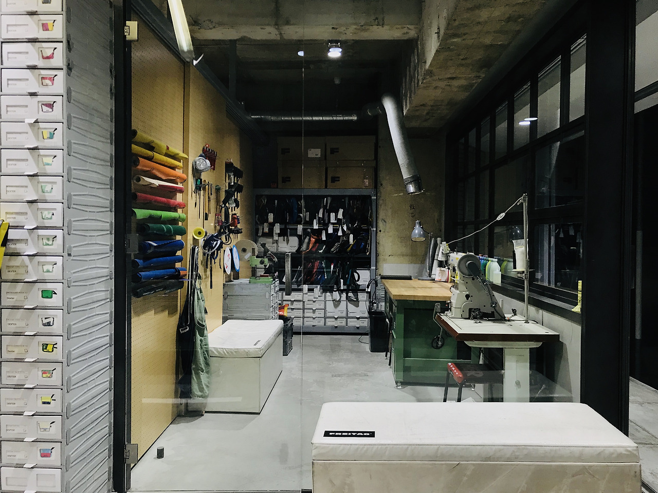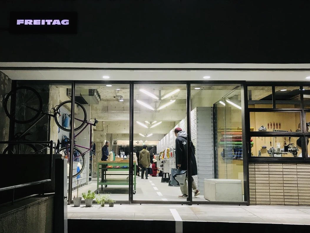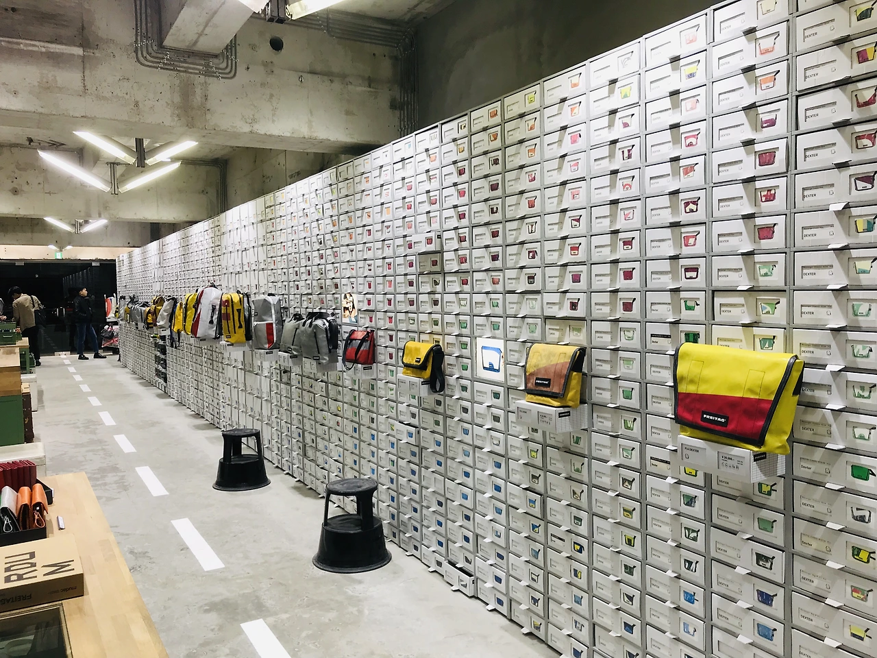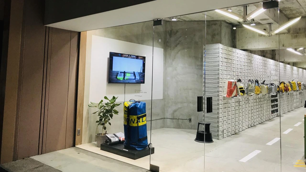 다음으로 프라이탁은 자신들의 제품을 판매하는 공간을 단순히 제품 판매 공간으로 생각하지 않고 이 곳에서만의 경험을 중요시 했다. 아쉽게도 국내에 정식 매장은 없지만 편집숍의 형태로 운영되는 국내 매장 역시 프라이탁의 인테리어 디자인을 재현하고 있다.(아마 프라이탁이 요구한 것 같다.) 프라이탁의 기본적인 인테리어는 노출 콘크리트 구조에 형광등을 활용한 약간은 팩토리 같은 공간 디스플레이를 통해 자신들이 생산하는 제품을 충실히 쇼잉하고 있다.