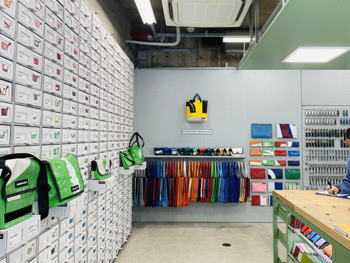효율적인 매장 디스플레이와 더불어 자신들의 제품을 소품으로 활용(소파, 테이블 등)하여 매장 곳곳에서 프라이탁의 정신을 경험하게 도와준다.