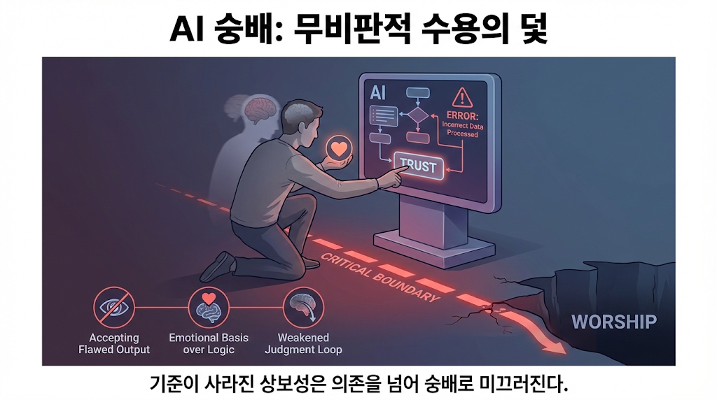둘째, 그 수용이 논리적 검토가 아닌 "AI가 그랬으니까"라는 감정적 근거에 기반할 때.