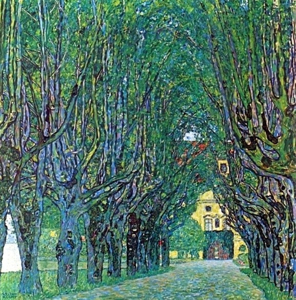 <카머 성 공원의 가로수 길>을 보면 정면에 있는 주택으로 가는 길에 울창한 가로수가 늘어서 있다. 보통의 화가라면 집을 중심 소재로 성정한 후 가로수를 멋들어지게 그렸을 것이다. 하지만 클림트는 가로수 그 자체를 화면 가득 강조하는 특이한 구도를 사용했다. 그의 풍경화에서는 공간이 끼어들 틈이 없다. 이 작품에서도 공간이라고는 지붕과 가로수 사이에 난 간신히 표현된 공간뿐이다. 여기에서 관람자의 시선은 자연스레 원근의 소실점 역할을 하는 정면의 주택을 향하지만 마치 가로수 길 사이로 난 작은 틈을 통해서 보는 것 처럼 답답한 느낌이 든다. 반면 길 양편으로 가지런히 늘어선 가로수의 기둥과 가지가 수직선처럼 쭉쭉 뻗어 강한 생동감을 느끼게 한다.