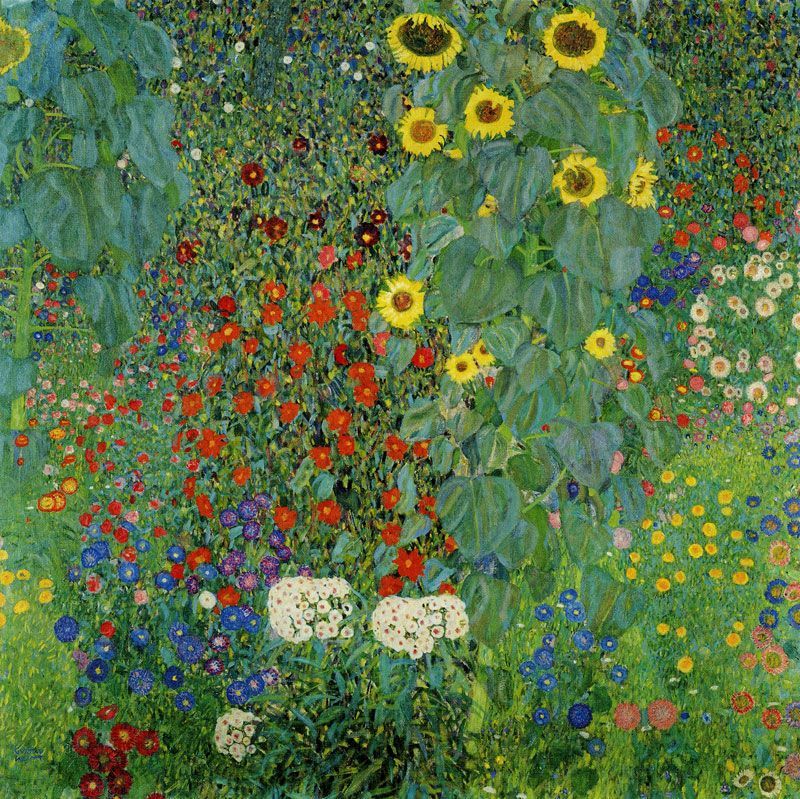 그래서인지 그의 풍경은 고요하면서도 명상적이다. 그의 풍경에는 인물도 없고 특별한 주제도 없다. 이런 특징은 모네의 풍경도 마찬가지지만 한 가지 다른 점은 모네에겐 빛과 공간이 필수적이었다면 클림트의 풍경에는 이마저도 없다. 공간은커녕 화면 가득 꽃과 집과 나무만 있을 뿐이다. 그의 풍경은 대부분 정사각형 틀에 그려졌는데 직사각형 틀에 그려진 보통의 풍경화와는 상당히 다른 느낌을 준다.