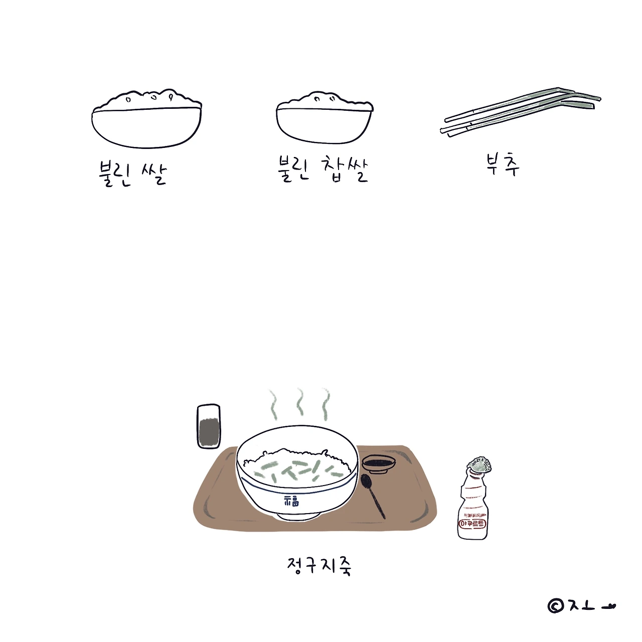 ‘죽 먹어’소리에 비적비적 일어나 상 앞에 앉았다. 상 위에는 간 없이 멥쌀과 찹쌀을 반반 섞어 정구지를 듬성듬성 썰어 뭉근하게 끓인 정구지죽 한 사발, 왜간장 한 종지, 야쿠르트 한 병이 놓여 있었다.