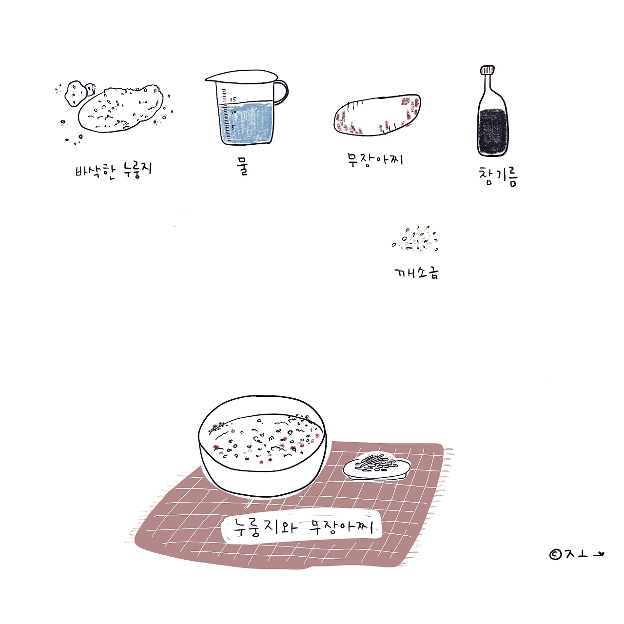 밥 먹기 싫을 때, 냉장고에 반찬이 있어도 나를 위한 밥상 차리기 귀찮을 때, 집안에 먹을 것이 없을 때, 아니면 정말로 몸이 아파 먹기 힘들 때면 죽이 아닌 뜨끈한 누룽지가 생각났다.