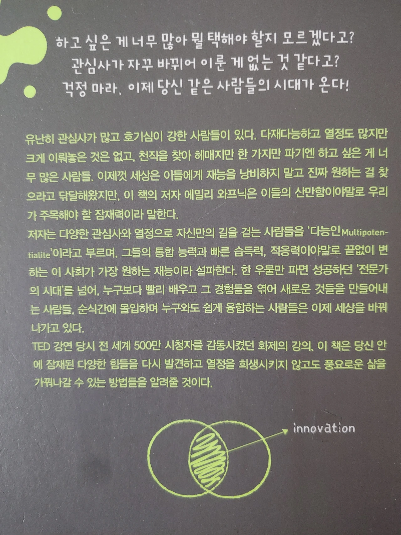 다능인도 개발된 다능인과 그렇지 못한 다능인이 있는데 인간은 환경의 동물이라 이것이 개인의 문제라고 생각할 수는 없는 것 같다. 개발되지 않은 다능인이라고 우울해할 것은 없는 것 같다.(나도 개발되지 않은 쪽에 속하는 것 같다.) 심지어 이 책을 읽을 여유조차 없는 사람도 있을 것이다.