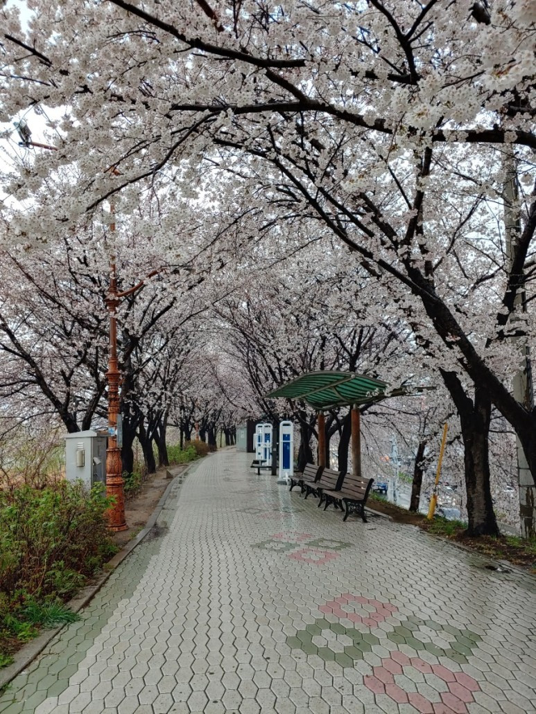벚꽃 피었을 때 안양천. 평소에는 사람이 많은데 이날은 비가 와서 한적히 걸을 수 있어 좋았다.