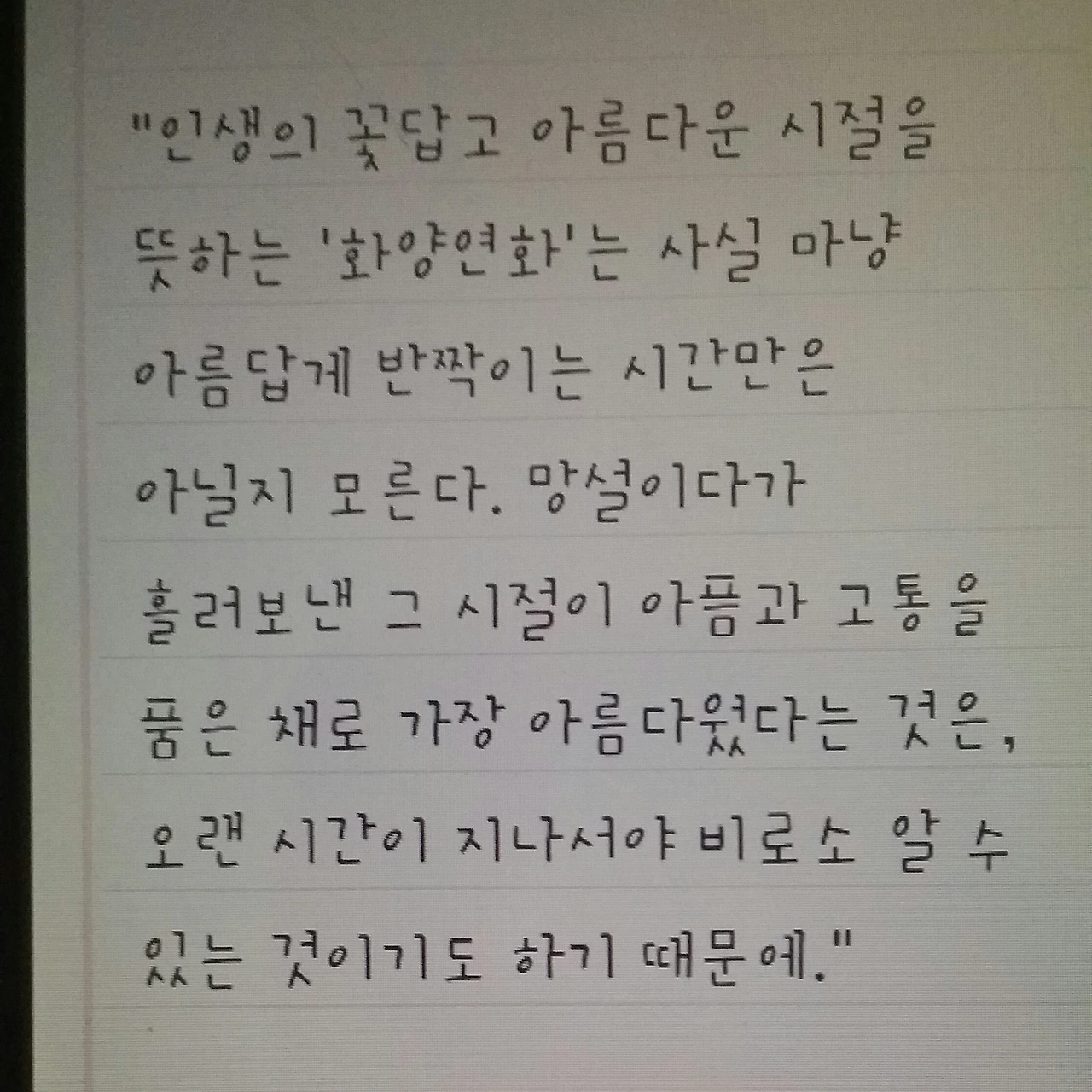 "인생의 꽃답고 아름다운 시절을 뜻하는 '화양연화'는 사실 마냥 아름답게 반짝이는 시간만은 아닐지 모른다. 망설이다가 흘러 보낸 그 시절이 아픔과 고통을 품은 채로 가장 아름다웠다는 것은, 오랜 시간이 지나서야 비로소 알 수 있는 것이기도 하기 때문에"