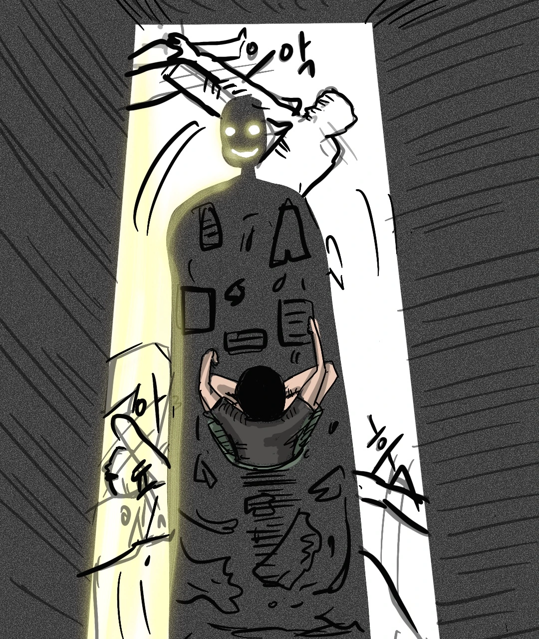 "늘"이 창문 밖을 보니 야구장의 벤치 클리어링을 보는 듯 그림자들이 서로의 없는 머리를 잡고 미친 듯이 싸우고 있었다. 서로가 먼저 "늘"에게 이야기하려고 하는 치열한 싸움을 하고 있는 것 같았다. 죽자 사자 싸우는 그들의 모습에 당황하는 "늘"에게 가만히 다가온 그림자는 다시 귓속말로 자신의 소개를 했다.