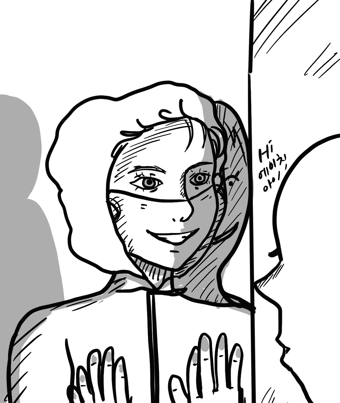 "늘"은 간신히 몸을 일으켜 눈을 비비며 문을 열었다. 문 앞에는 하얀 작업복을 입은 여자가 주뼛주뼛 거리며 서 있었다."늘"은 첫눈에 그녀가 그림자가 말하던 거의 죽어가는 수진이라는 걸 알아차릴 수 있었다. 그 이유는 온몸이 하얀색 위생용품으로 가득 덮여 있는 모습과 상반되게 양손에는 있어야 할 하얀 위생장갑의 자리에 햇볕에 거뭇거뭇하게 탄 열 손가락이 보였기 때문이었다. 그리고 마스크 안에서 어색하게 웃음 짓고 있는 수진의 모습에 "늘"은 자신이 할 수 있는 가장 살가운 목소리로 환영한다.