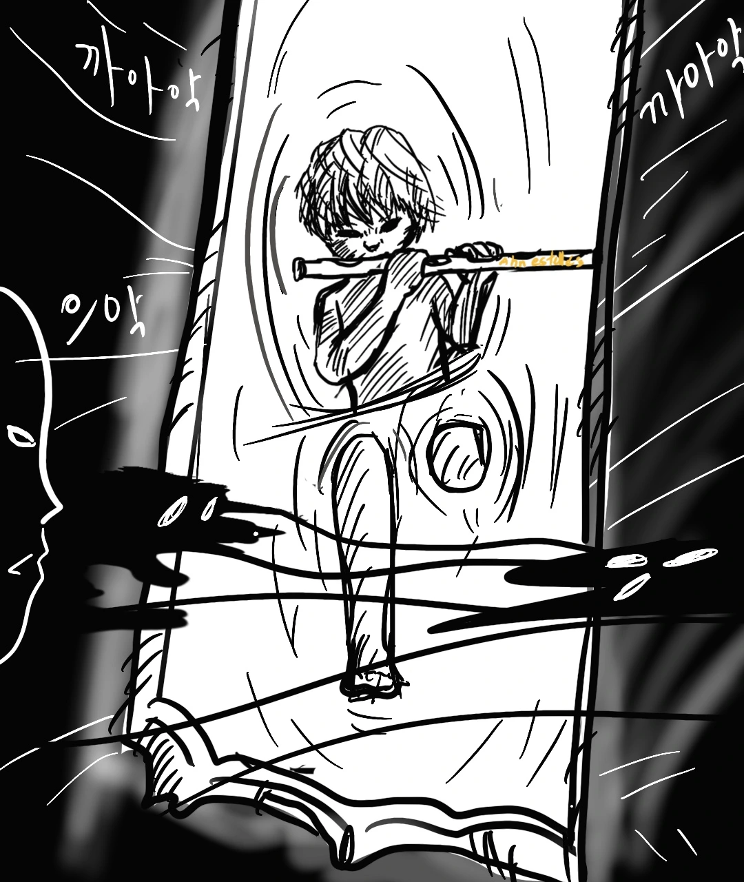 아버지의 뒤척이는 소리에 다시 제정신으로 돌아온 나는 다급하게 어둠 속에서 떨리는 심장을 부여잡으며 안 에스텔이 나에게 준 피리를 더듬더듬 찾아서 충동적으로 불기 시작했다.