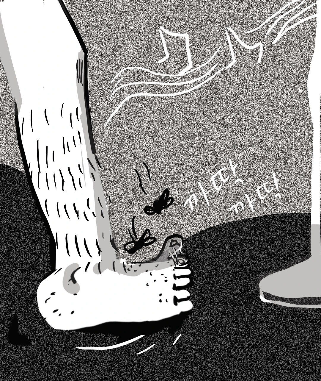그는 더럽고 냄새나는 그의 발을 나에게 꼼지락 거리며 치켜들어 보여주었다.