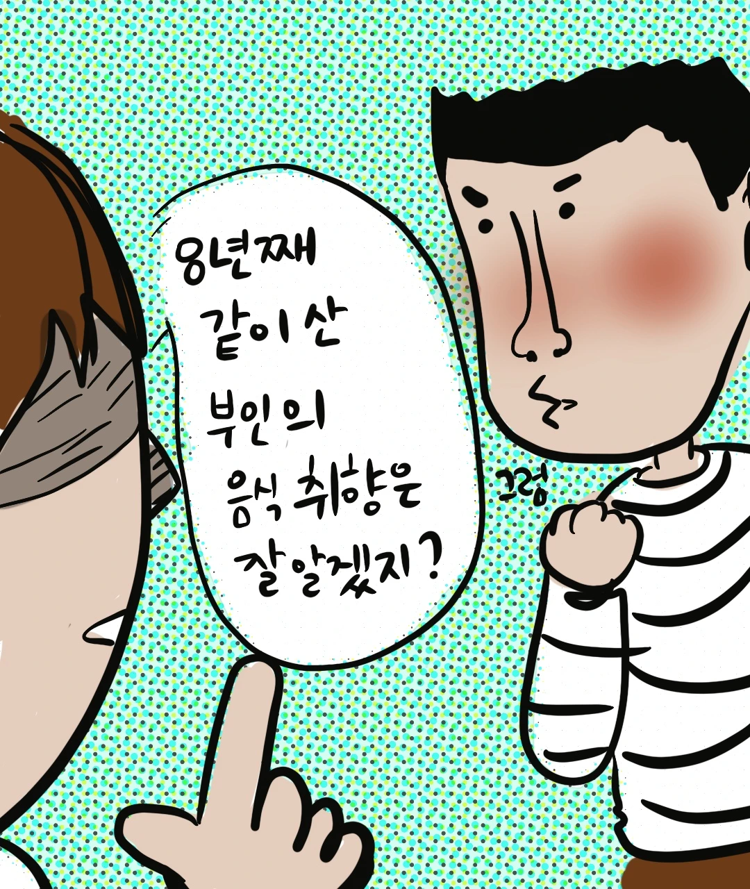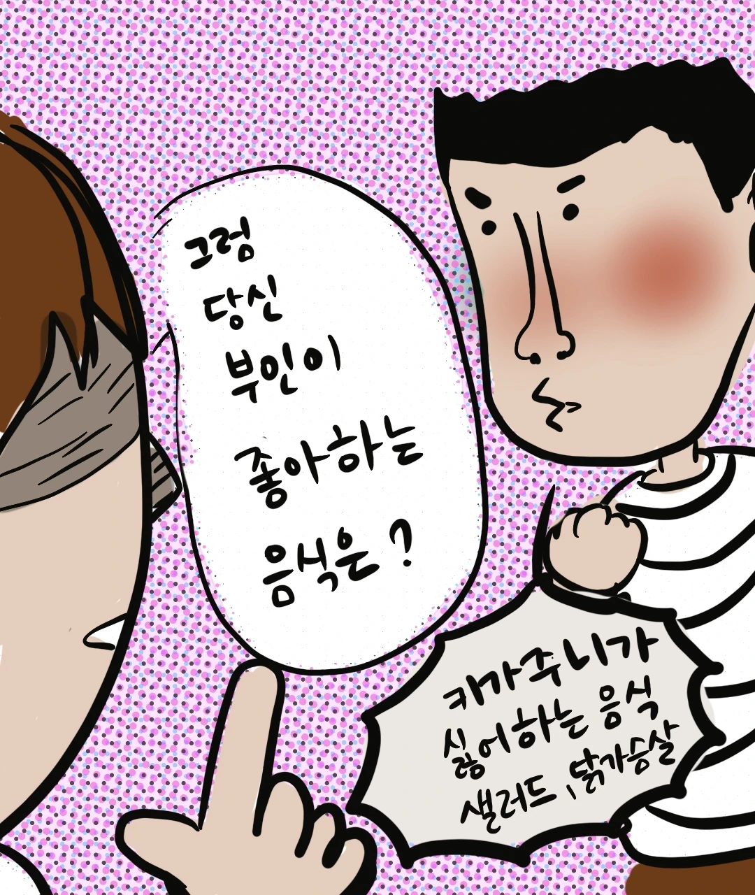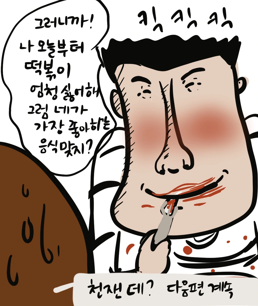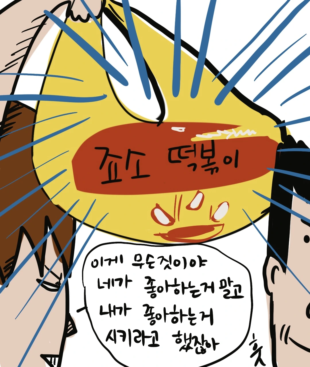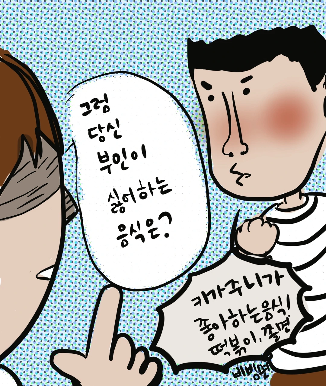 나는 남편이 좋아하는 음식을 좋아하지 않는다. 그가 좋아하는 떡볶이는 너무 맵고 짜장면은 너무 짜고 닭꼬치는 탄맛이 나서 좋아하지 않는다.