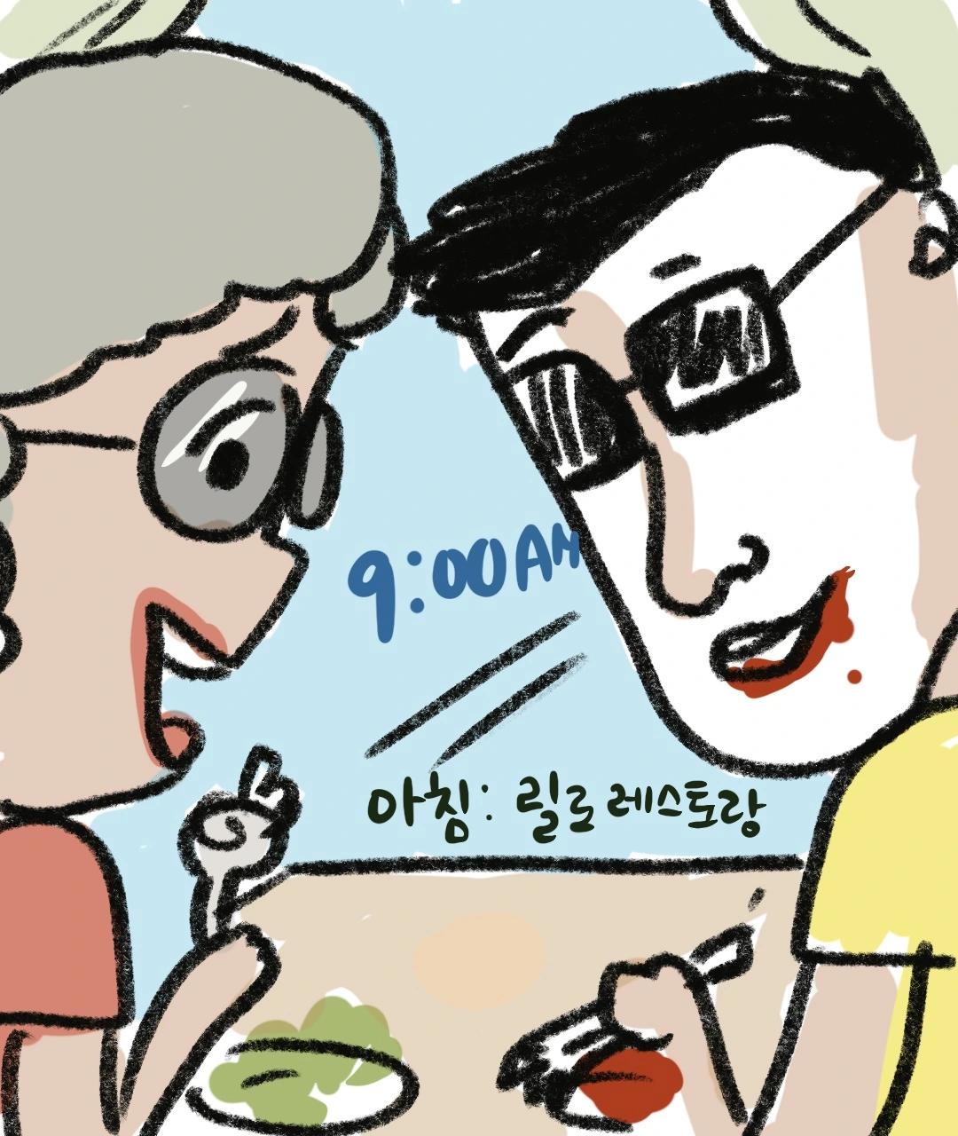 "자! 우리 원정대는 오늘 오전 9시에 릴로라는 레스토랑에 가서 아침을 먹고, 그다음에는 빛의 벙커를 가서 폴세잔 그림을 보고 다시 자전거를 빌려서 김녕 해수욕장에서 1시간가량 탄 다음에 다시 톰톰 카레집에 가서 카레를 먹고 사려니 숲길을 걷는 겁니다. 그리고 다시 숙소로 가서 체크인을 하고 룸서비스를 먹으면 오늘 일정이 끝이 납니다. 그러니까 일단 아침을 먹으러 가는 길은 대략 차로 1시간 30분 정도 걸리고 대기가 있을 수도 있으니 가능한 산책은 빨리 끝나고 출발해야 해야 합니다."