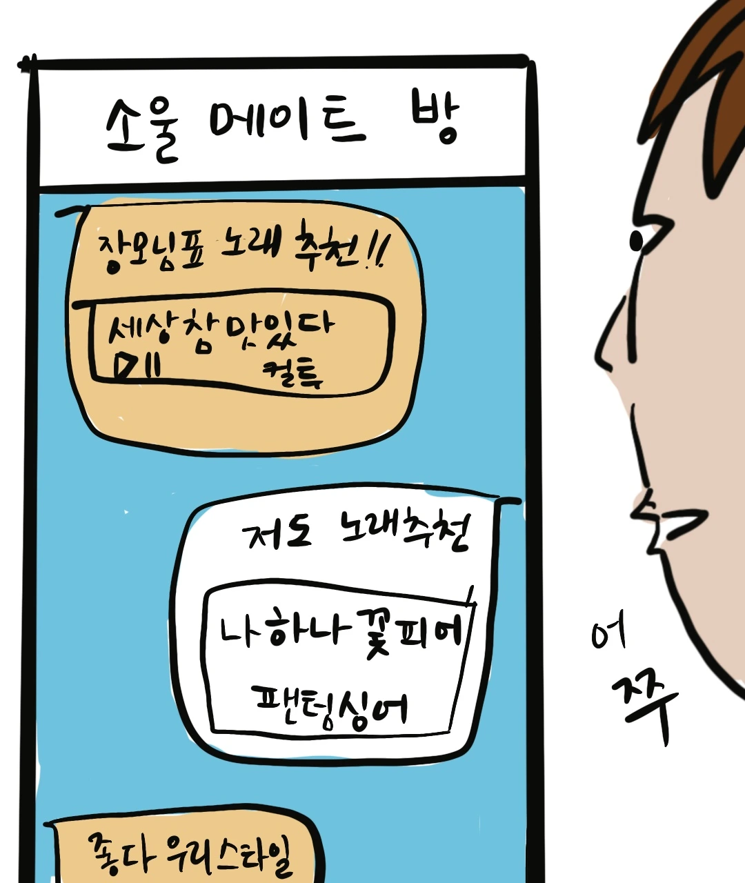 그 속에는 제주 여행을 갔다 온 후부터 활성화된 채팅방에서 서로에게 노래를 추천해 주고 불러보는 등 나로선 이해되지 않는 감성적인 대화들이 수두룩 했다.