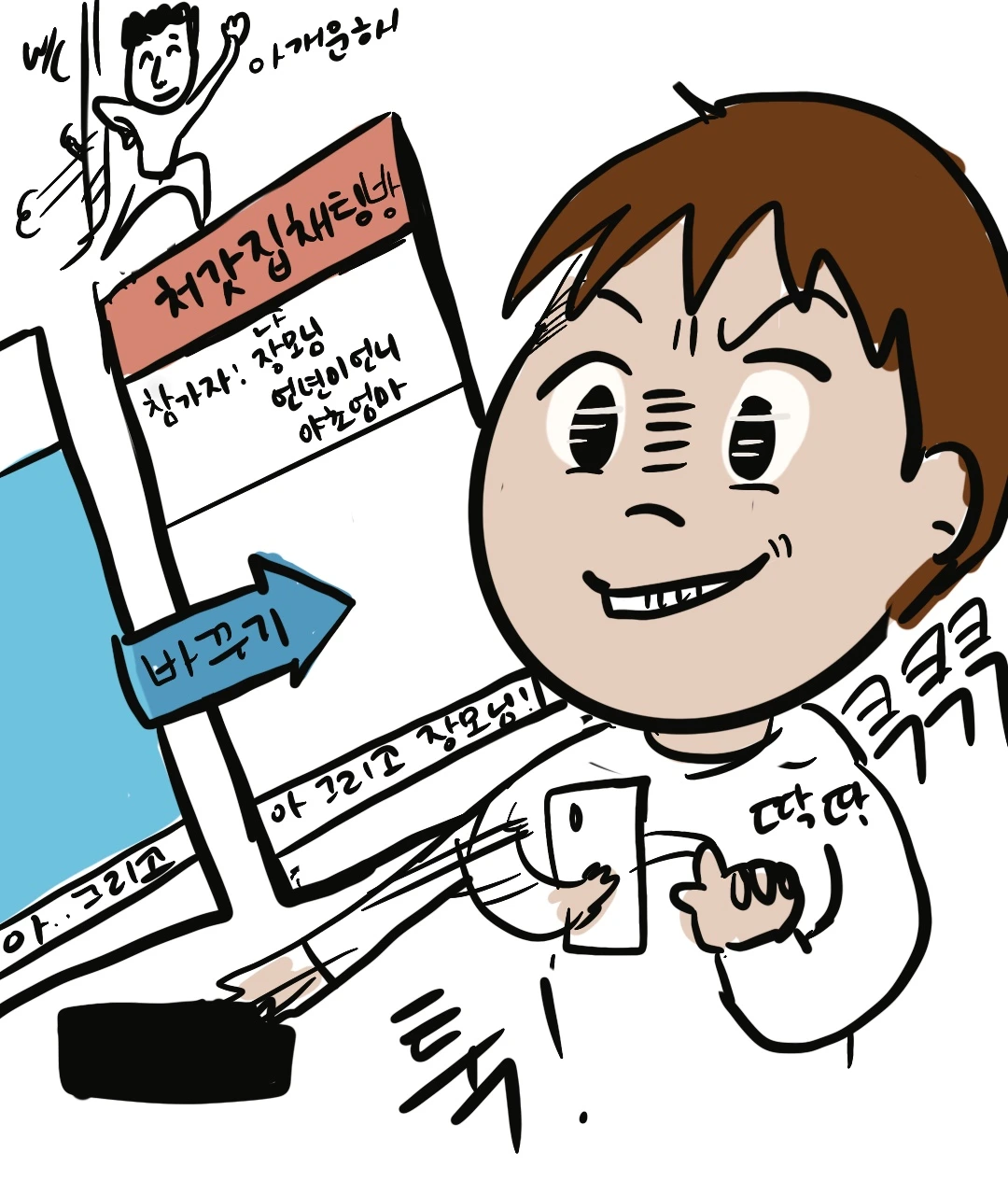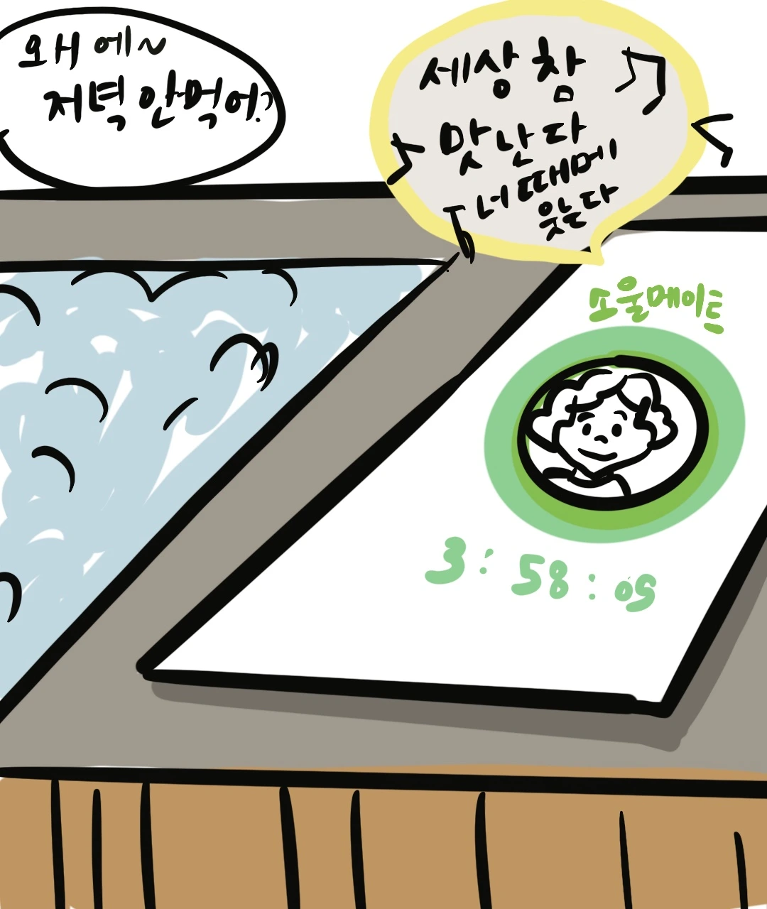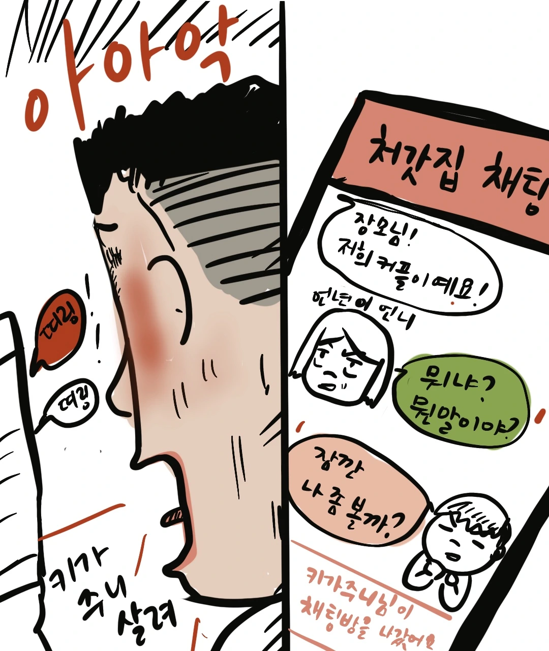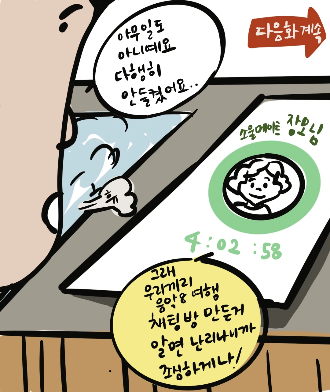 너무 행복해 보이는 대화내용에 나도 모르게 샘이 났는지 골탕을 먹이고 싶었던 건지 알 수 없었지만 화장실 다녀온 키가 주니가 이어서 쓸 수 있게 소울메이트 채팅방에서 처갓집 단체 채팅방으로 바꿔서 열어놨는데 커플 신발까지 나올 줄은 몰랐다. 언년이 언니는 아직도 그 둘이 뭐 하고 있었는지 알지 못한다.