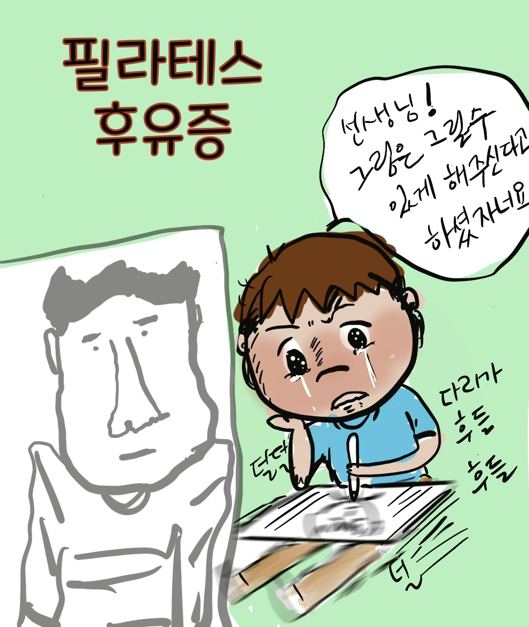 분명 그림을 그릴 수 있게 해 주시겠다 약속했는데… 발이 떨려 그림을 그릴 수가 없었다. 내 컴플레인을 들은 필라테스 선생님은 다리 떨며 그린 그림이 더 마음에 든다며 앞으로 다리 운동을 더 빡시게 시켜주시겠다고 하셨다.
