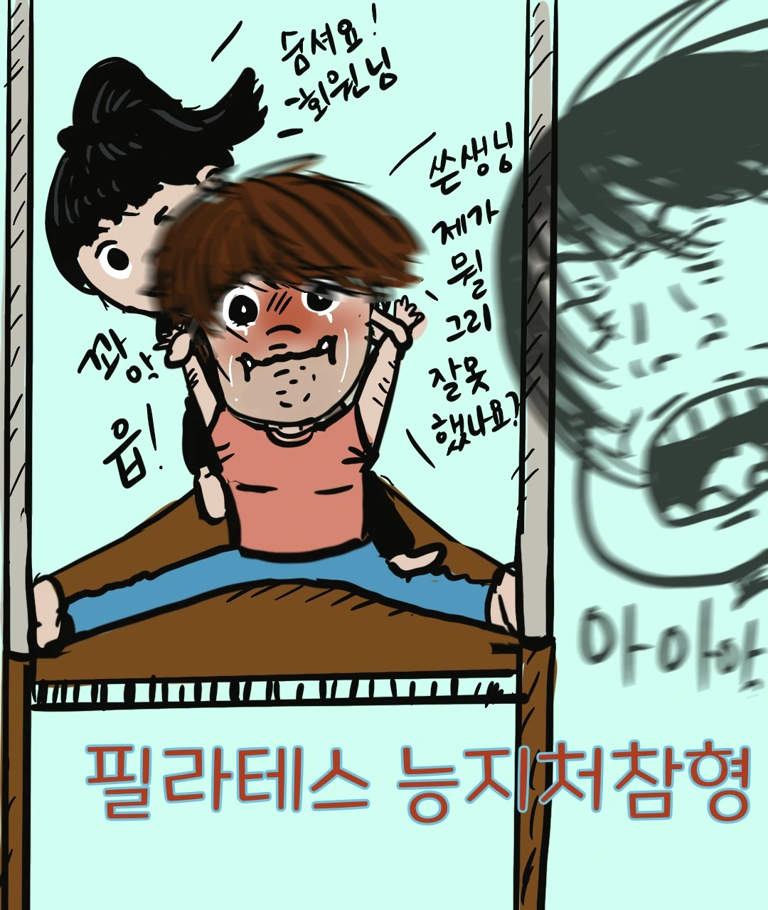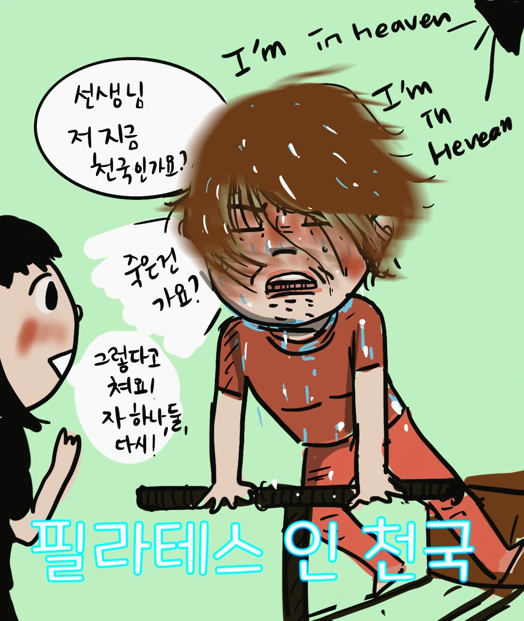필라테스를 할 때마다 나오는 곡이 점점 귀에 거슬리기 시작했다. 분명 내가 있는 곳은 지옥인데… 계속 들리는 천국에 있다며 세뇌시키는 듯한 노래. 심지어 그 노래를 들으며 콧노래를 부르는 선생님의 모습에 소름이 돋았다
