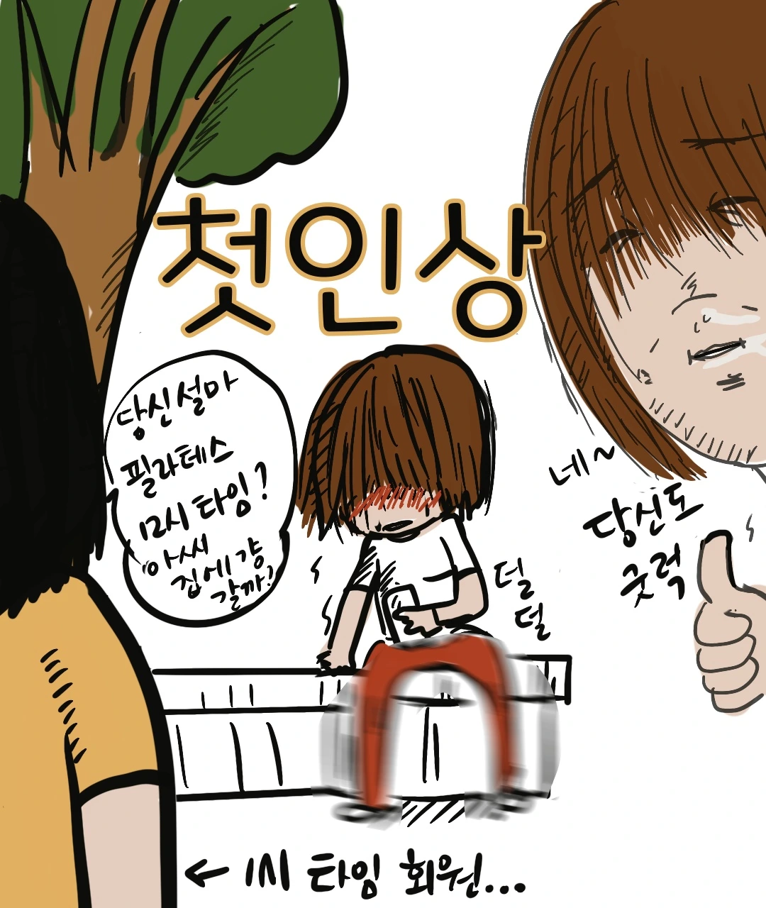 필라테스가 끝나고 잠시 벤치에 앉아 쉬고 있는데.. 나를 쳐다보고 있는 시선이 느껴졌다. 흔들리는 그녀의 동공을 보고 나는 확신했다. 내가 그녀의 미래의 모습이라는 걸…