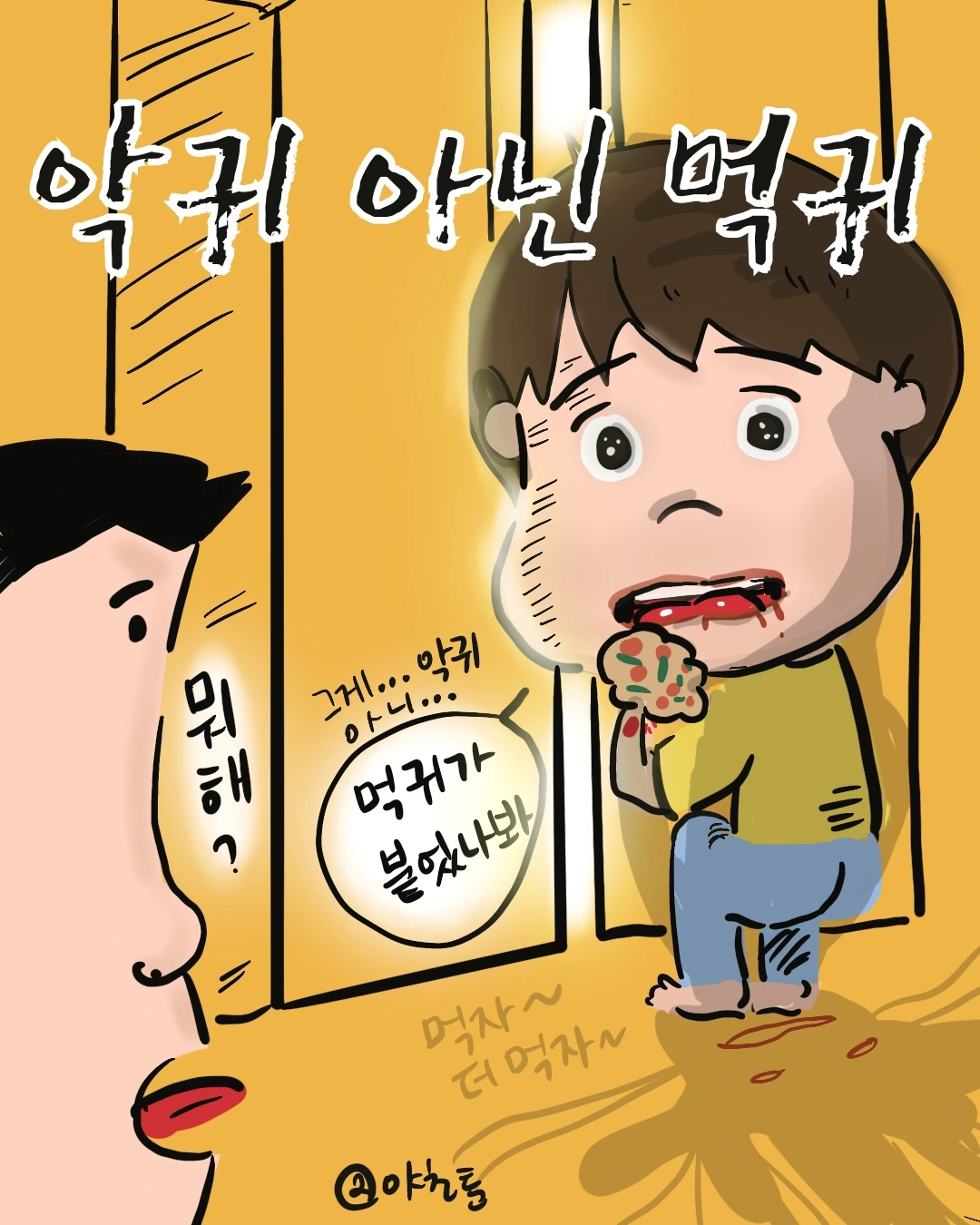 "당신에게 먹자귀신인 먹.귀.가 붙었어요. 최근에 바닥에 떨어진 음식을 주어 먹은 적이 있나요?"