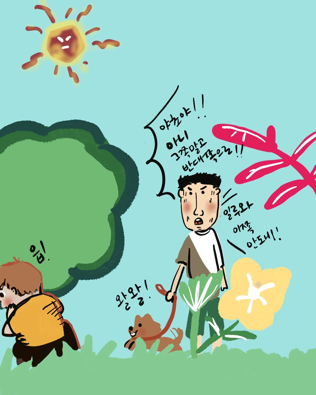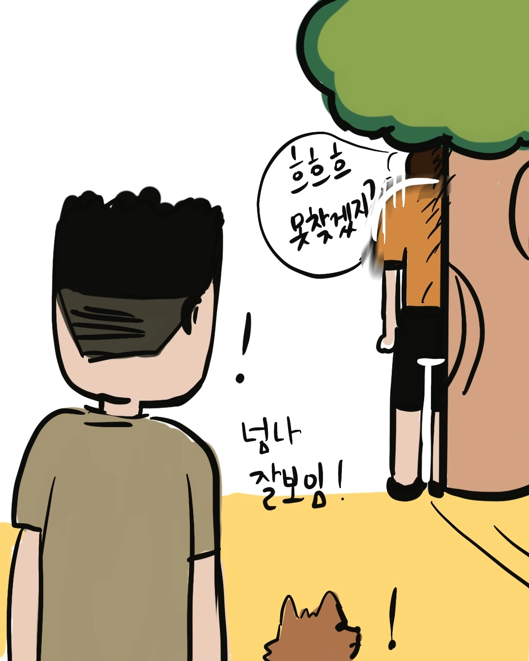 비록 32도가 넘는 땡볕이었어도, 야초를 속일 수 있다는 생각에 신이 나서 서둘러 나무 뒤에 숨었는데…. 숨는 족족 야초는 귀신같이 나를 찾아냈다. 어떻게 나를 찾는지는 정확히 알 수 없었지만, 한 가지 분명한 건 소통을 강요한 키가 주니가 야초에게 계속 안된다며 소리를 지르는 걸 보니 제2의 강형욱이 되기는 어려울 것 같다.