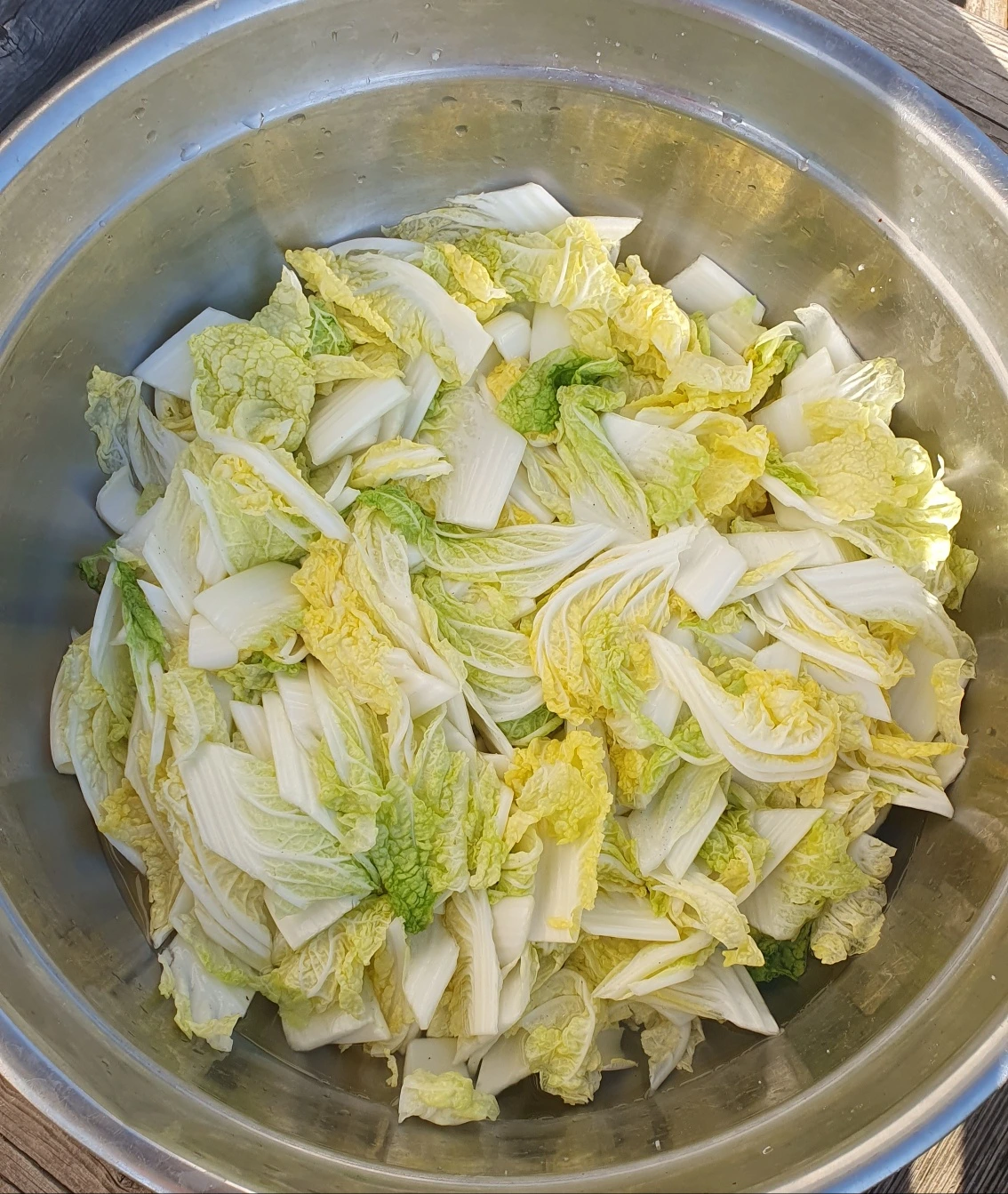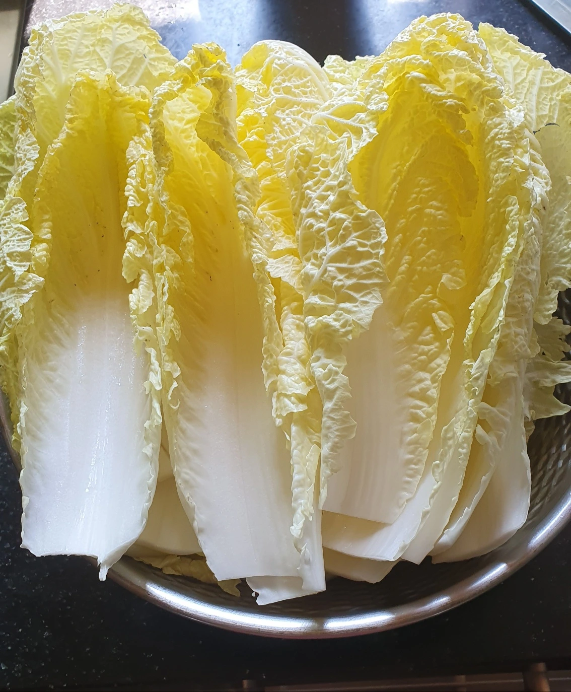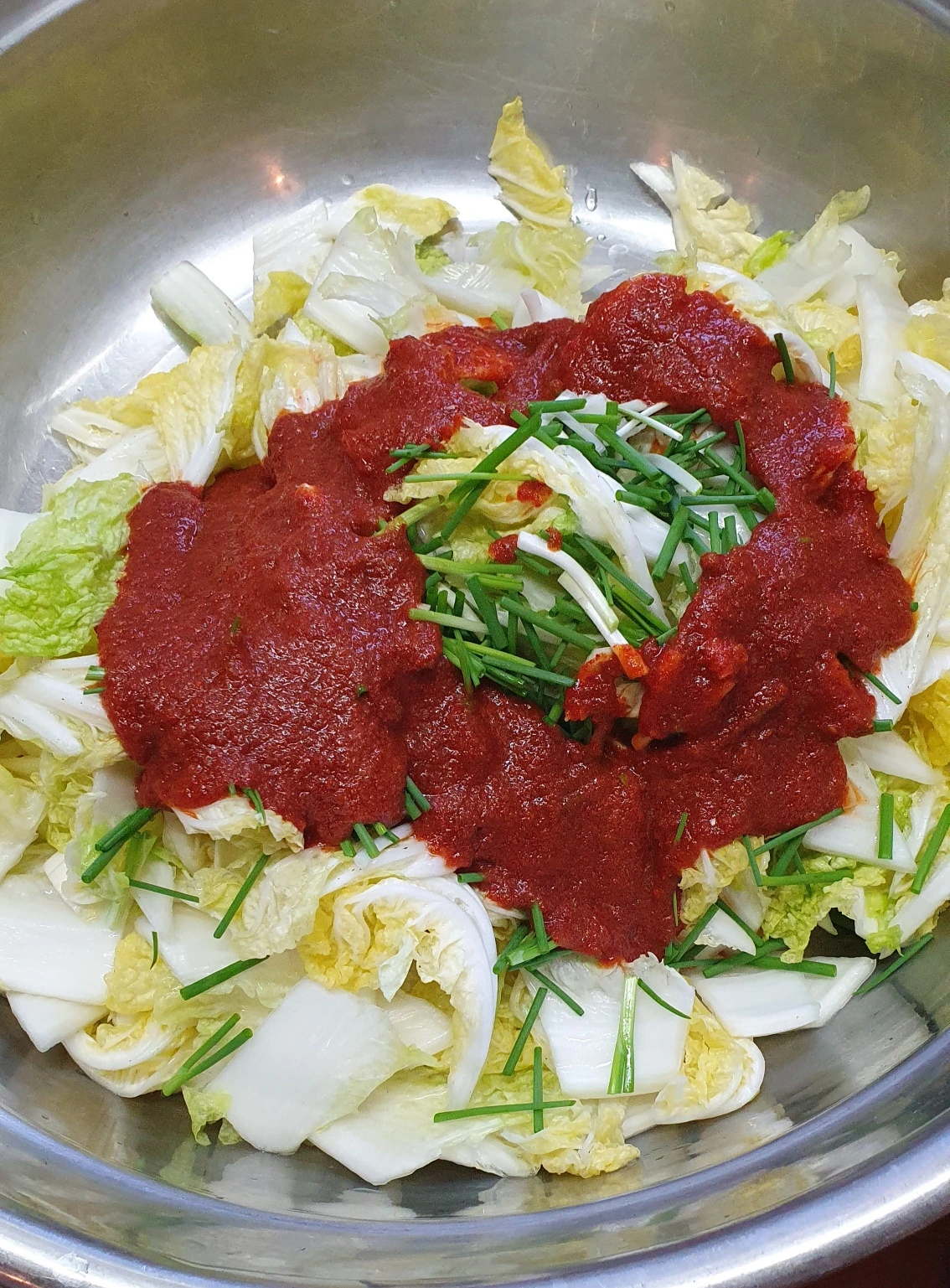 2. 물 세 컵을 부어 40분 중간에 위아래로 뒤집어 절인다음 두 번 헹궈 물기를 잘 빼주고 양념 만들어 버무려버려~