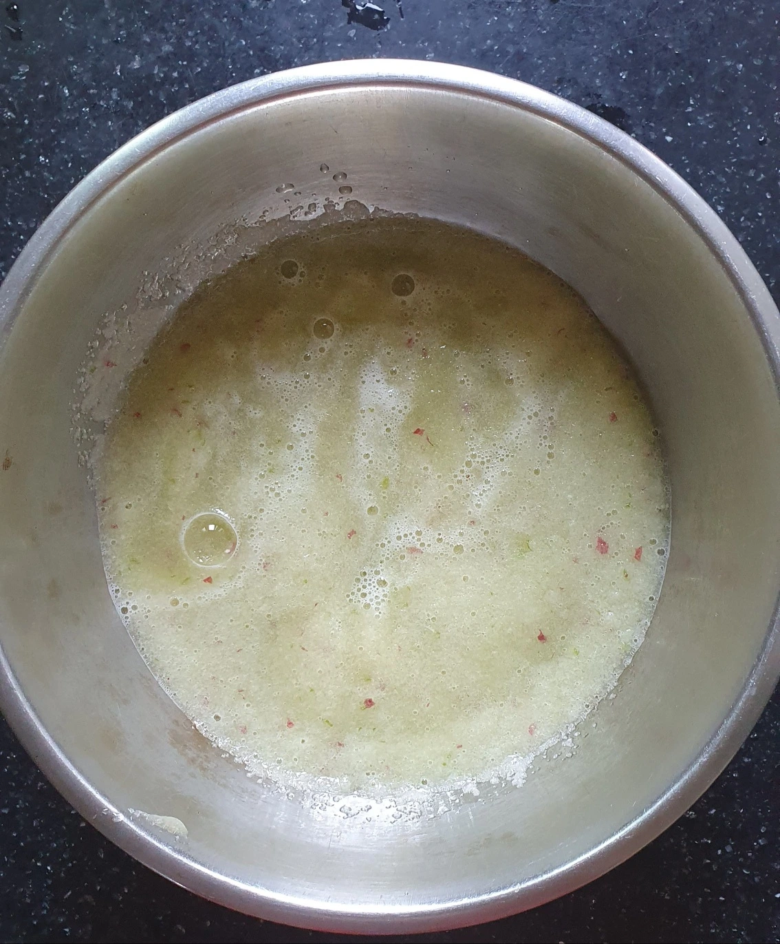 3. 양파 반 개 썰고 작은 마늘 8쪽 사과도 4분의 1쪽 새우젓 반 스푼 넣고, 믹서에 갈아줘