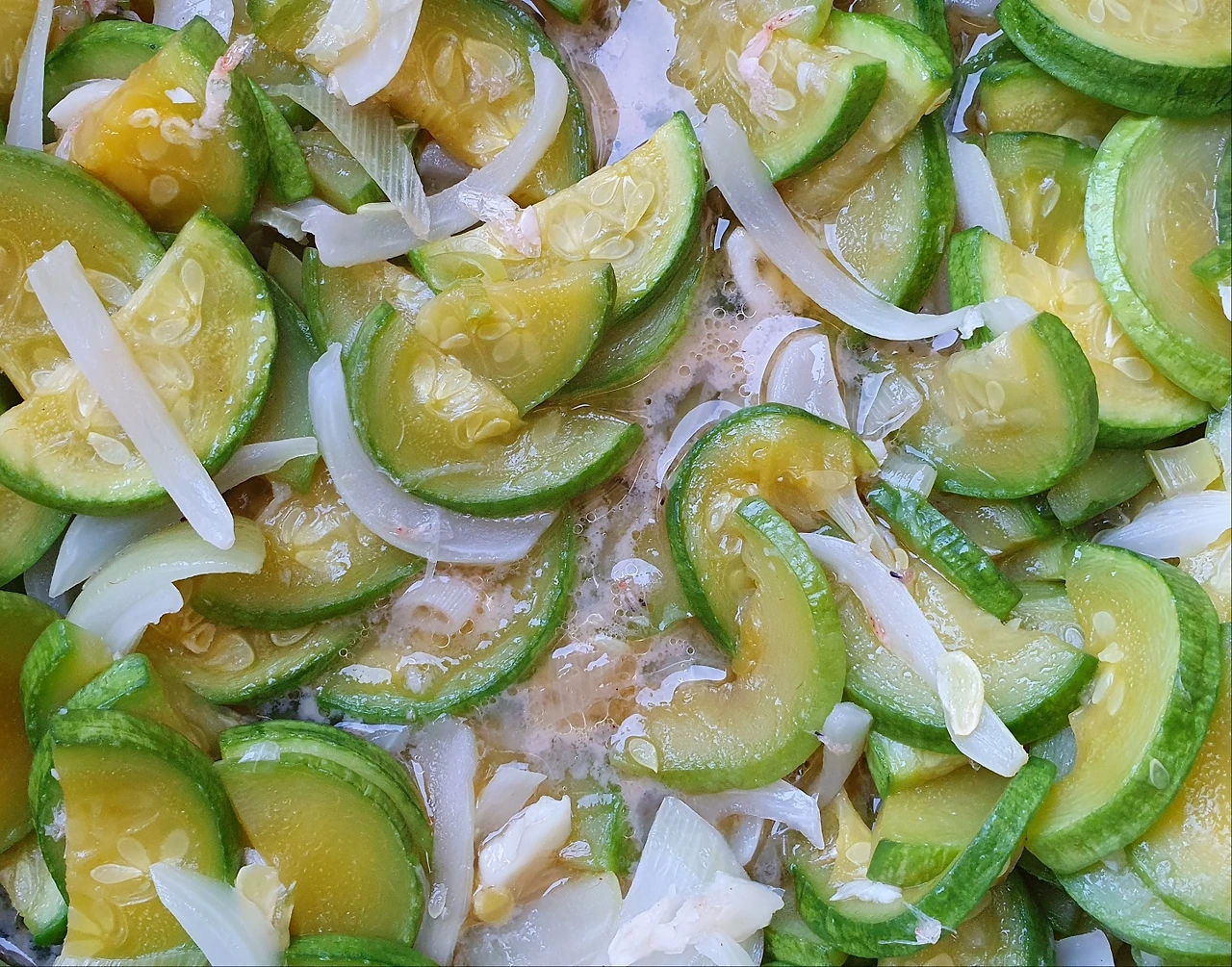 3. 대파와 다진 마늘 볶다가 썰어둔 호박과 양파 새우젓 반 스푼 투하 이때 매실 청 한 스푼 넣어주면 호박은 달달해지면서 새우젓 비린맛도 줄어든단다~