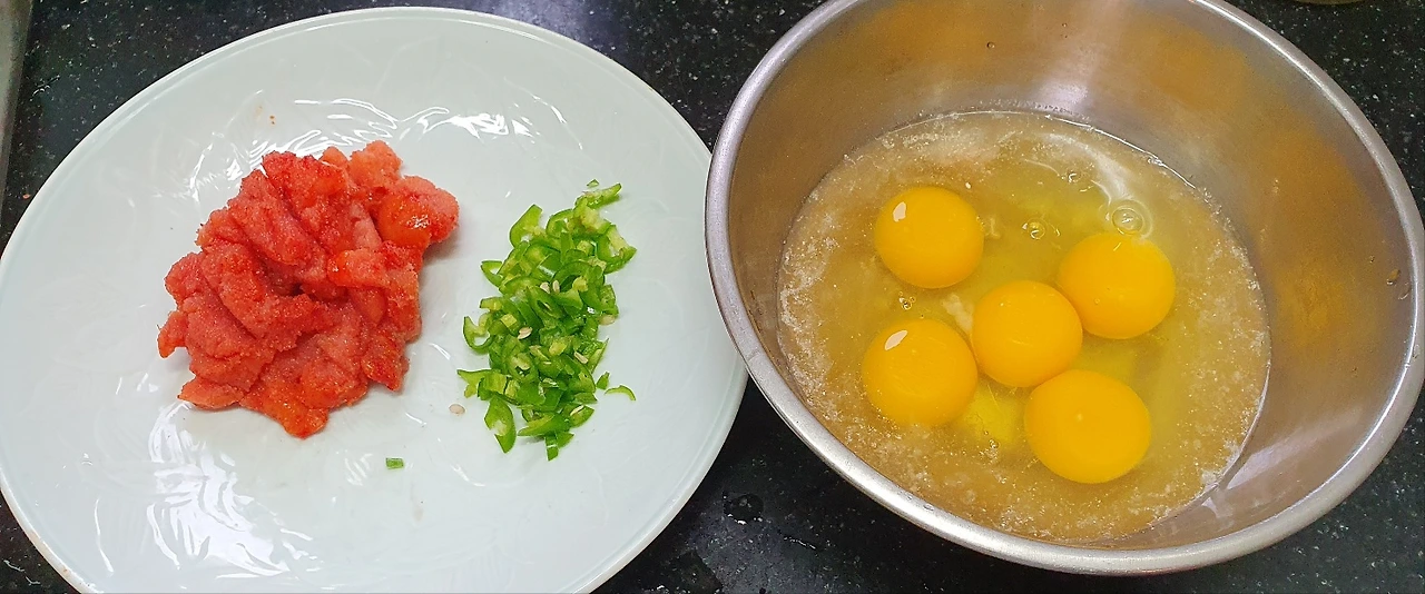 준비물 : 달걀 3알, 명란 한 개, 청양고추 반 개, 식용유 끝