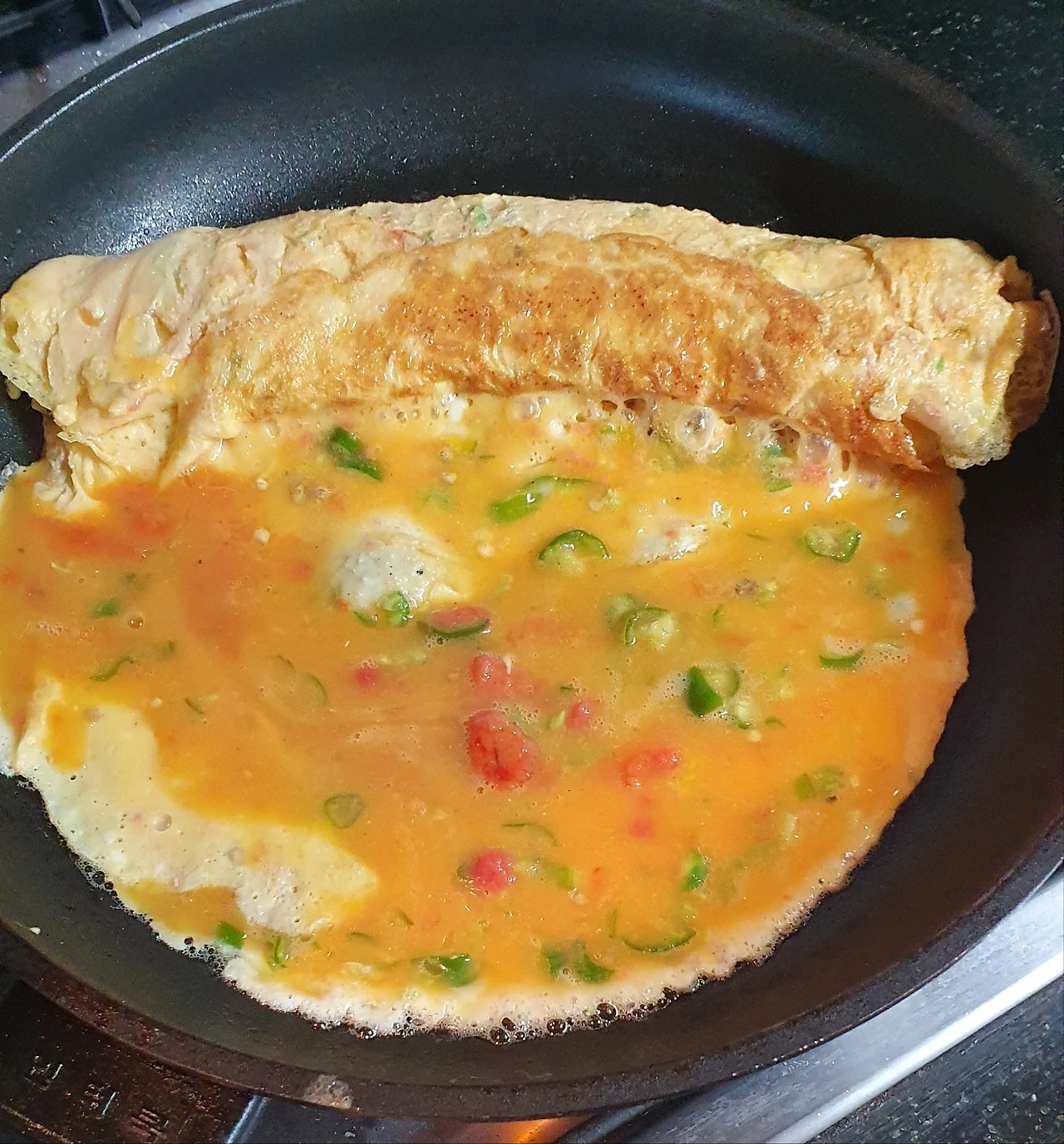 3. 약불로 은근히 익힌 다음에 밑바닥이 익으면 조금씩 접어서 계란물을 부어~