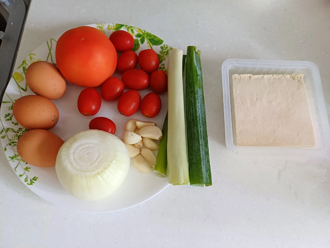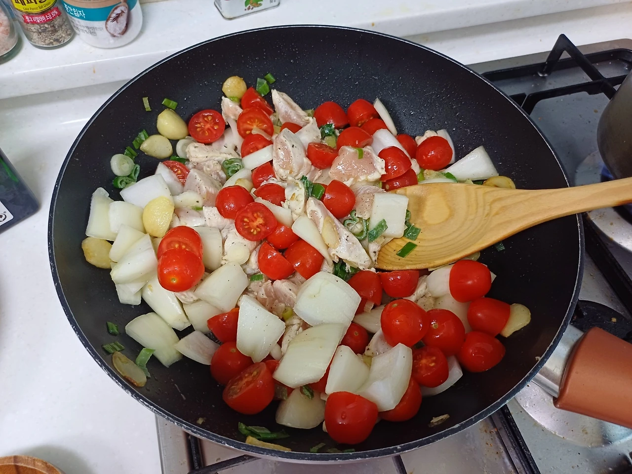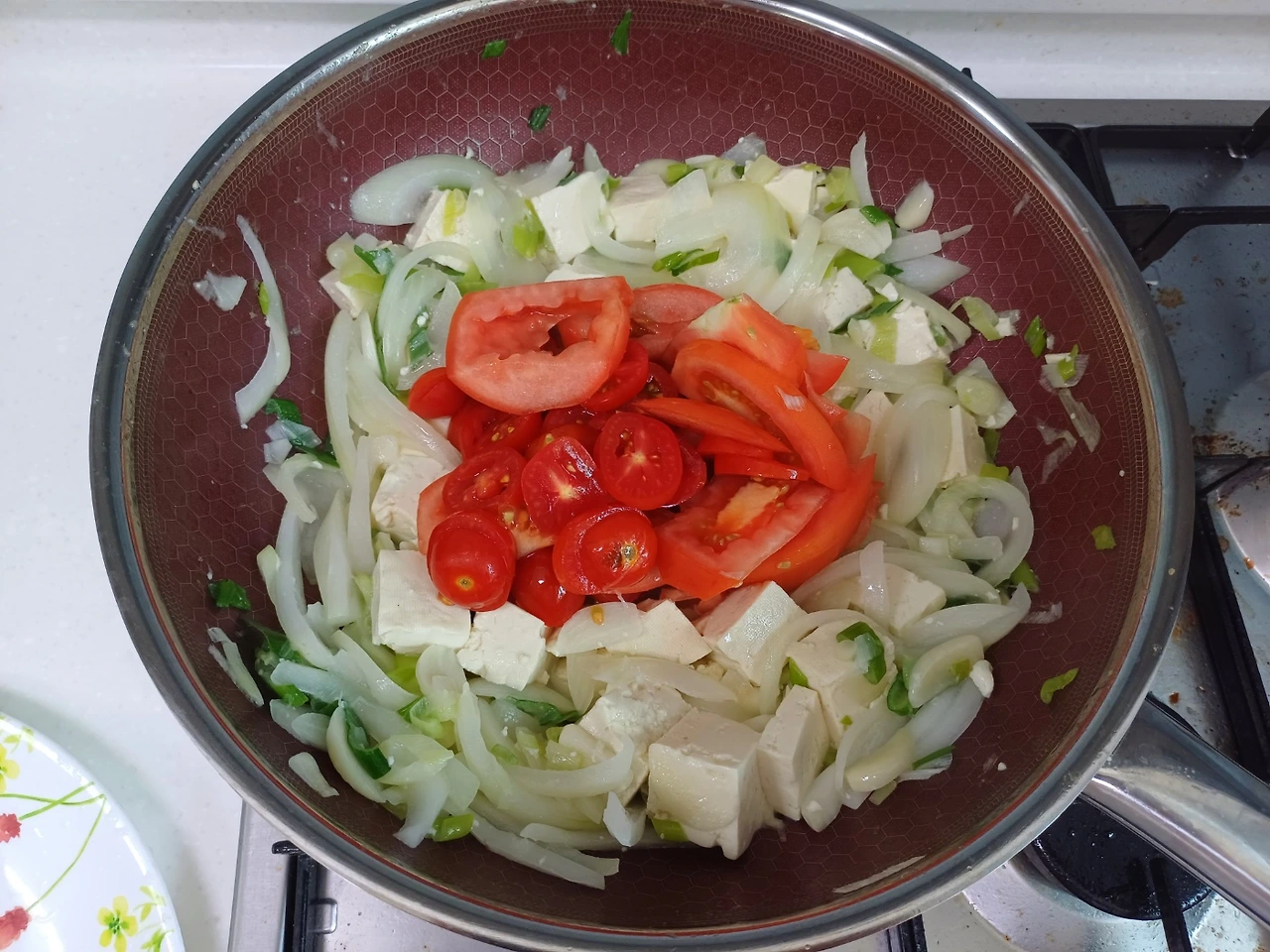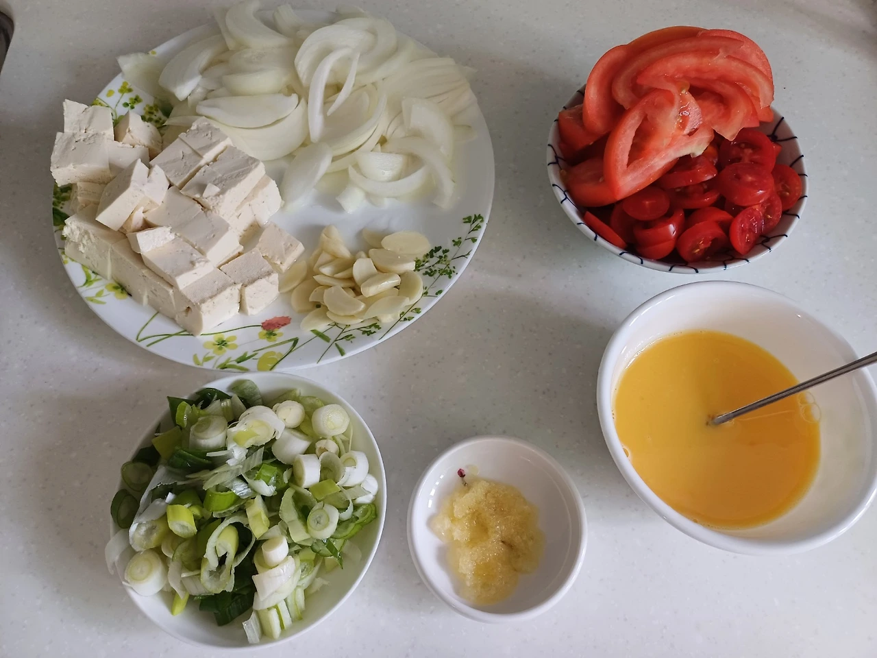 재료: 큰 토마토 1개, 작은 방울토마토 10알 마늘 8알, 양파 한 개, 대파 한 움큼, 계랑 2~3알, 부침두부 1개, 굴소스 반스푼, 후추 조금, 소금 한 꼬집, 참기름 반 스푼