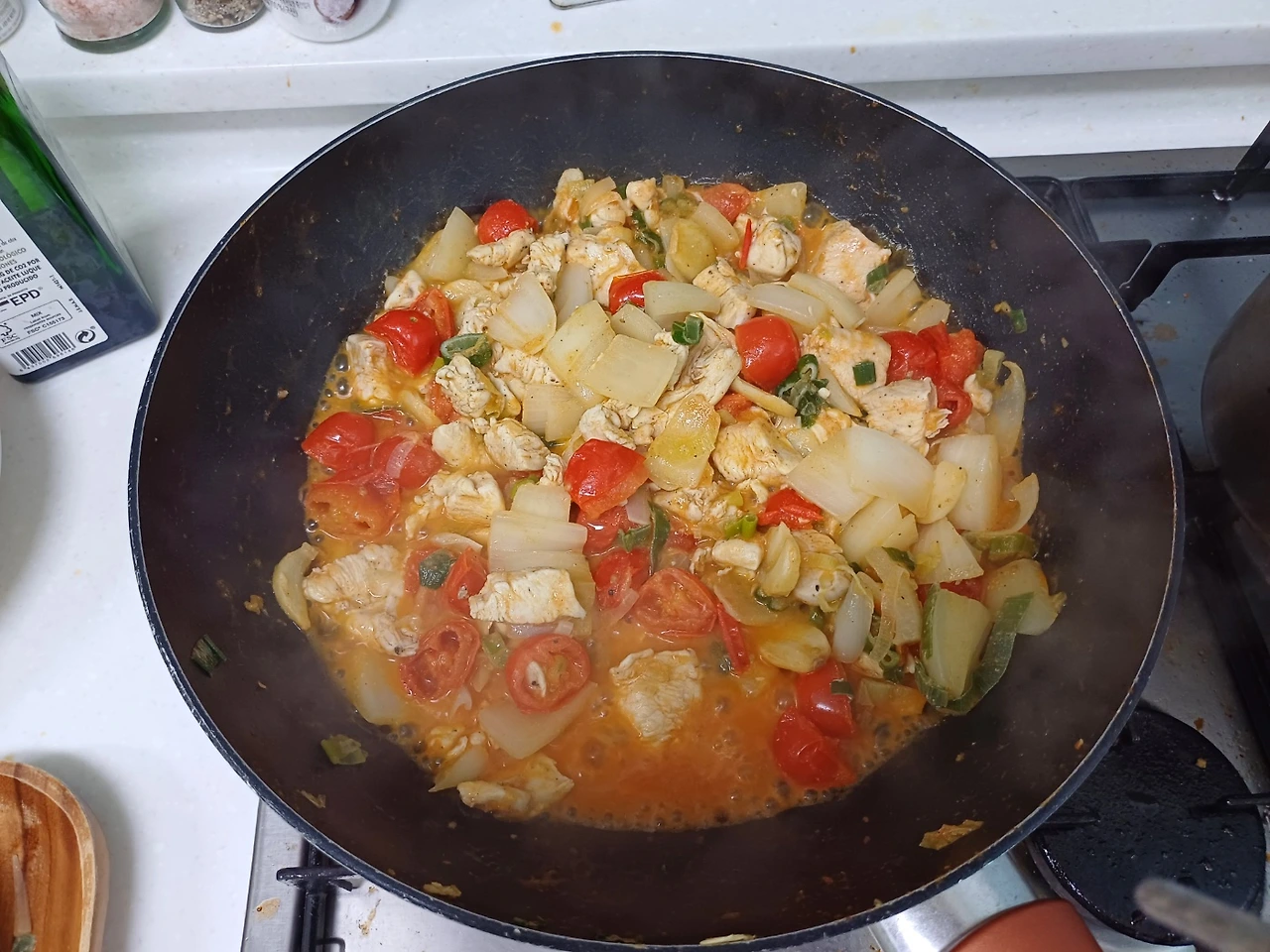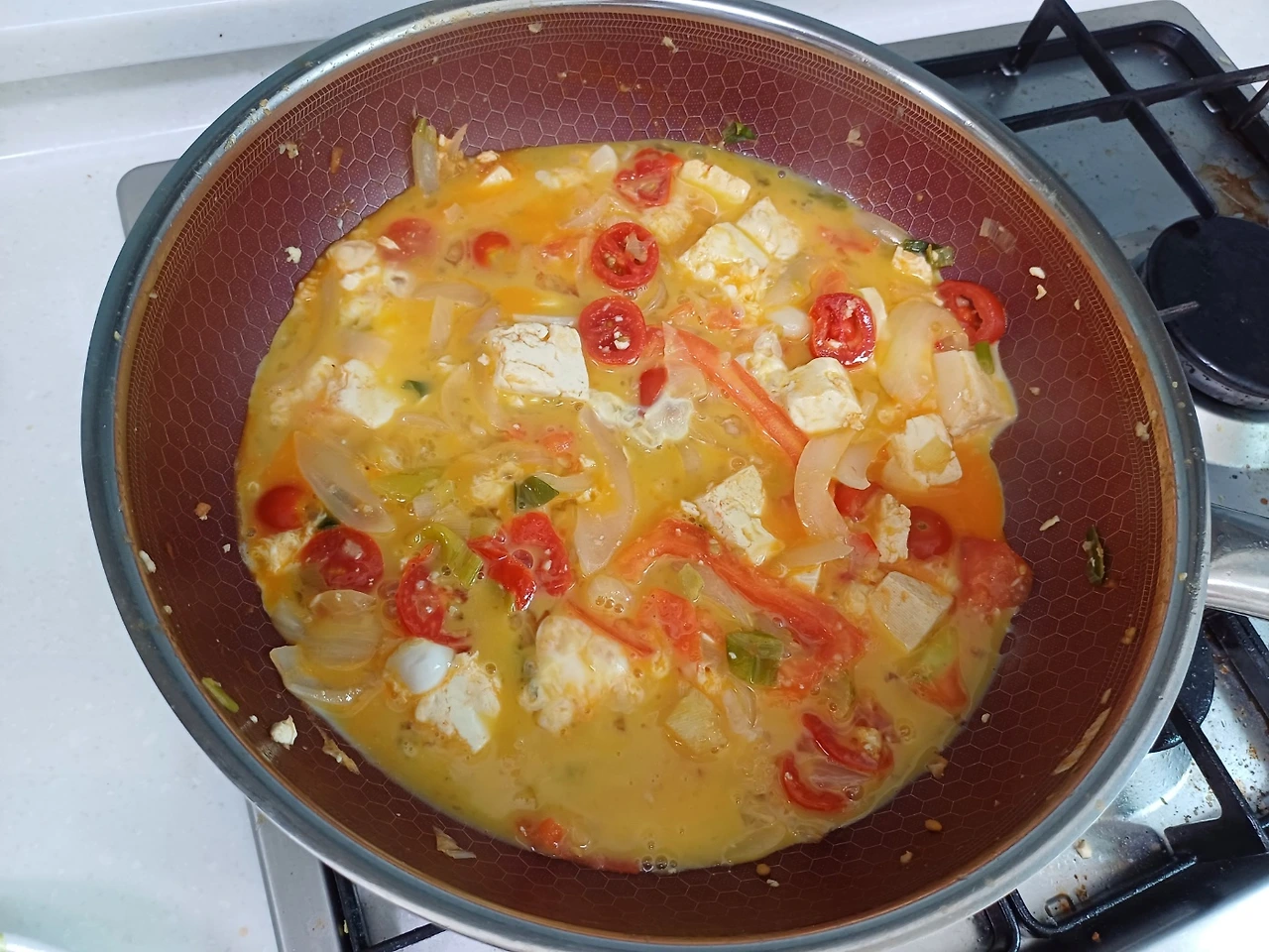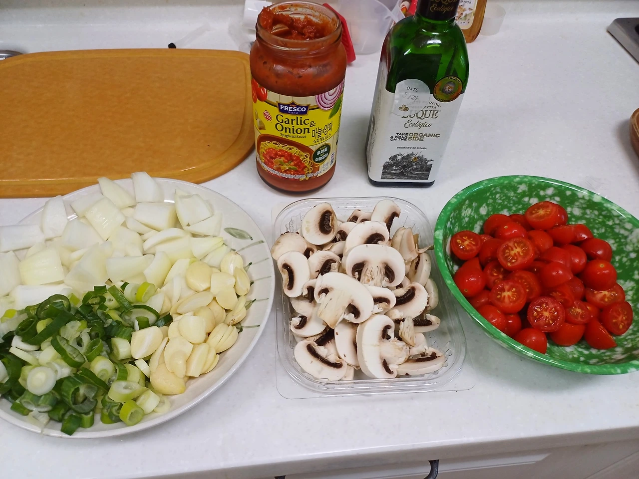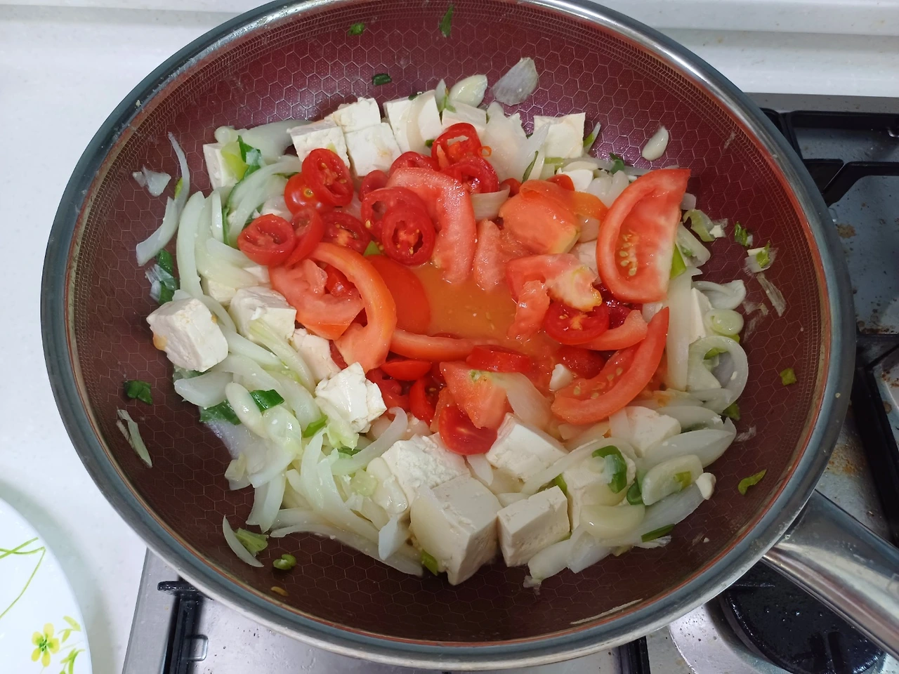 재료: 큰 토마토 1개, 작은 방울토마토 10알 마늘 8알, 양파 한 개, 대파 한 움큼, 계랑 2~3알, 부침두부 1개, 굴소스 반스푼, 후추 조금, 소금 한 꼬집, 참기름 반 스푼