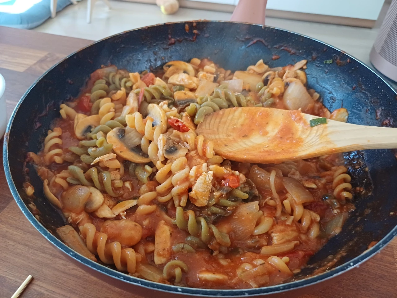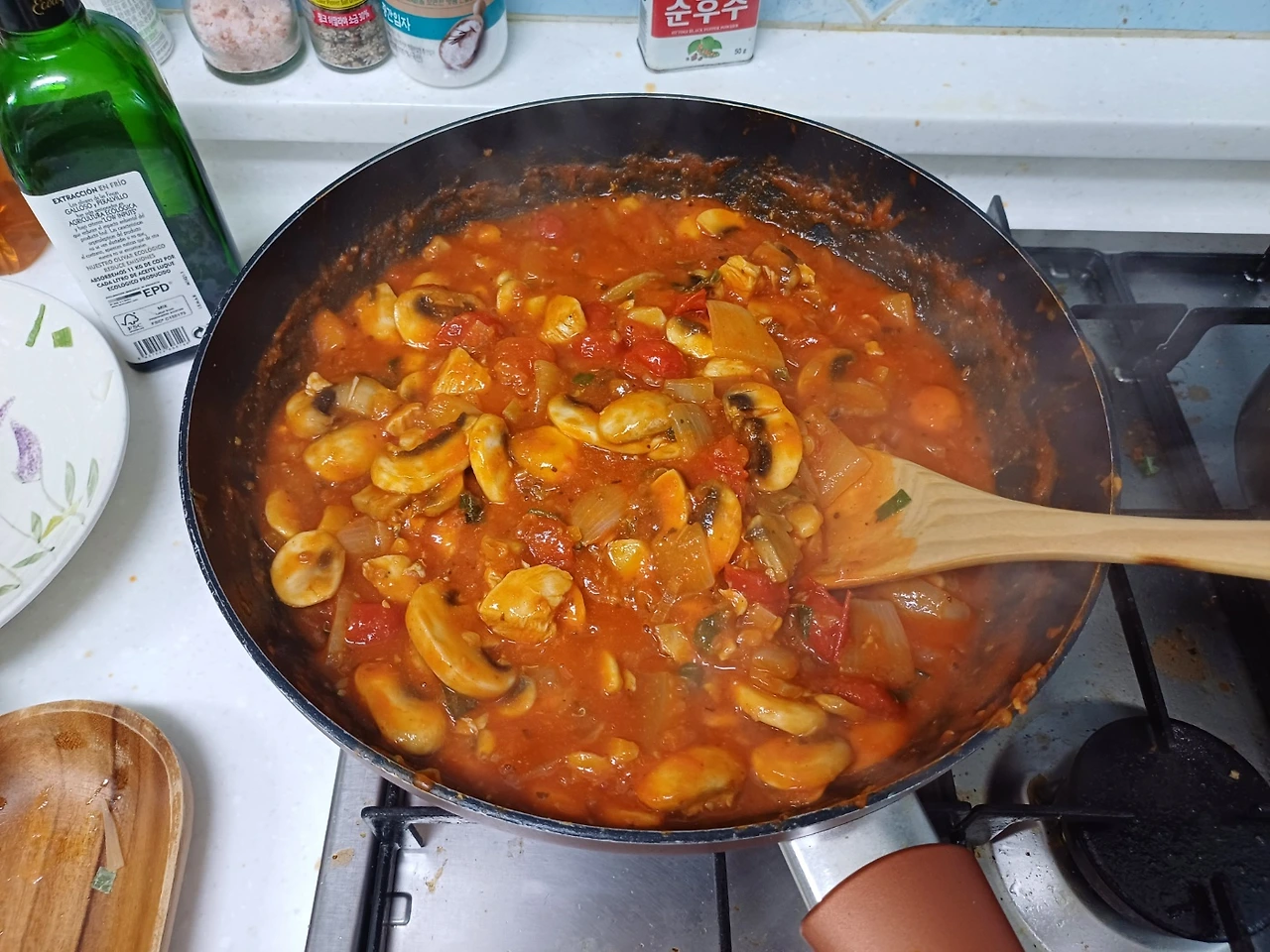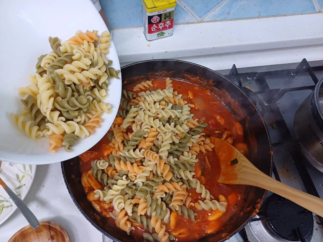 남편의 실없는 농담에 어이없다면서 닭가슴살 토마토 푸실리를 한 스푼 떠서 입에 넣었는데 따뜻한 토마토에서 나오는 단물과 그 안에 잘게 부서져 있는 마늘향이 향긋함이 식도를 타고 미끄러지듯이 내려갔다.