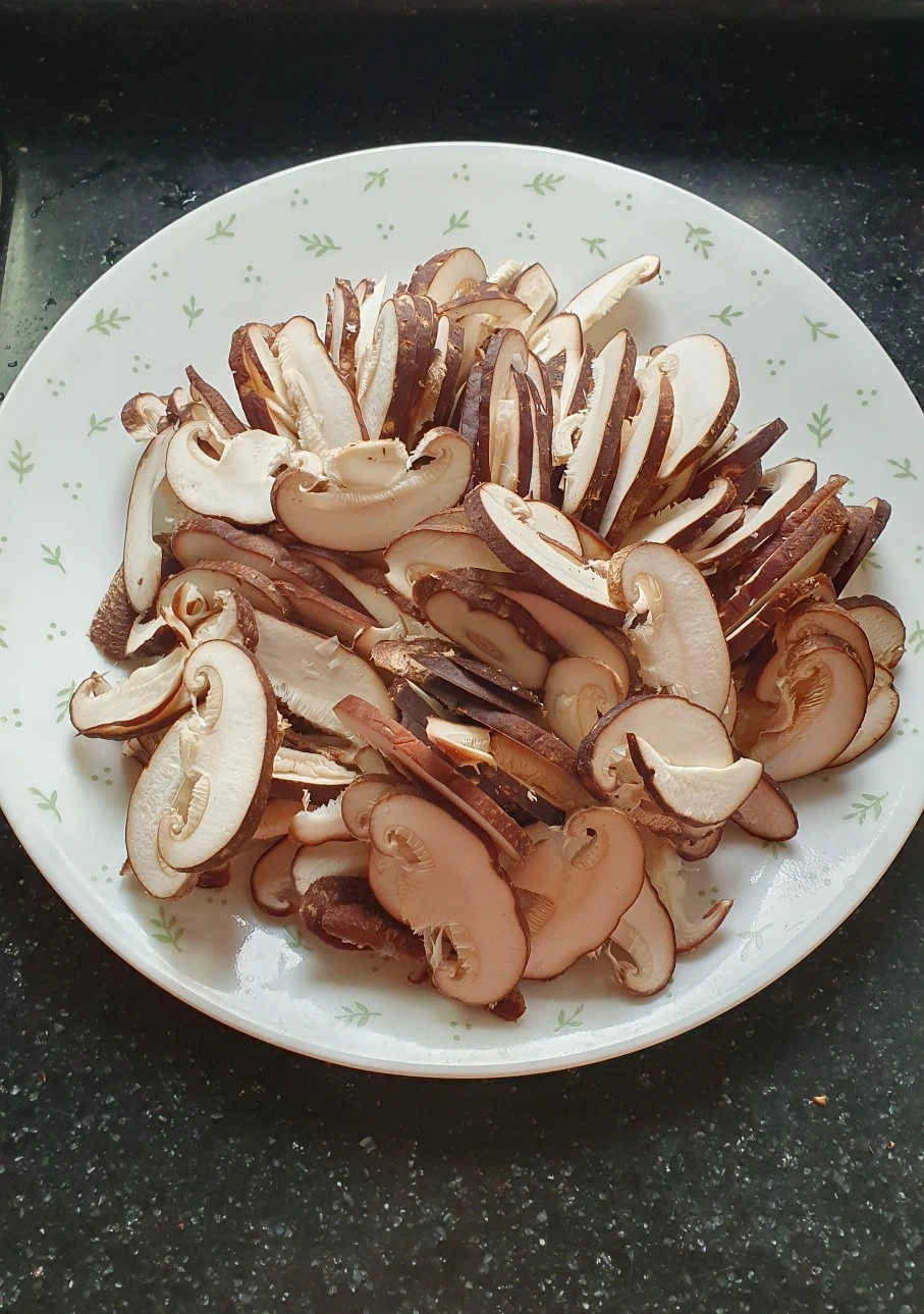 1. 표고버섯 열개를 기둥 잘라내고 슬라이스로 썰어주어라.