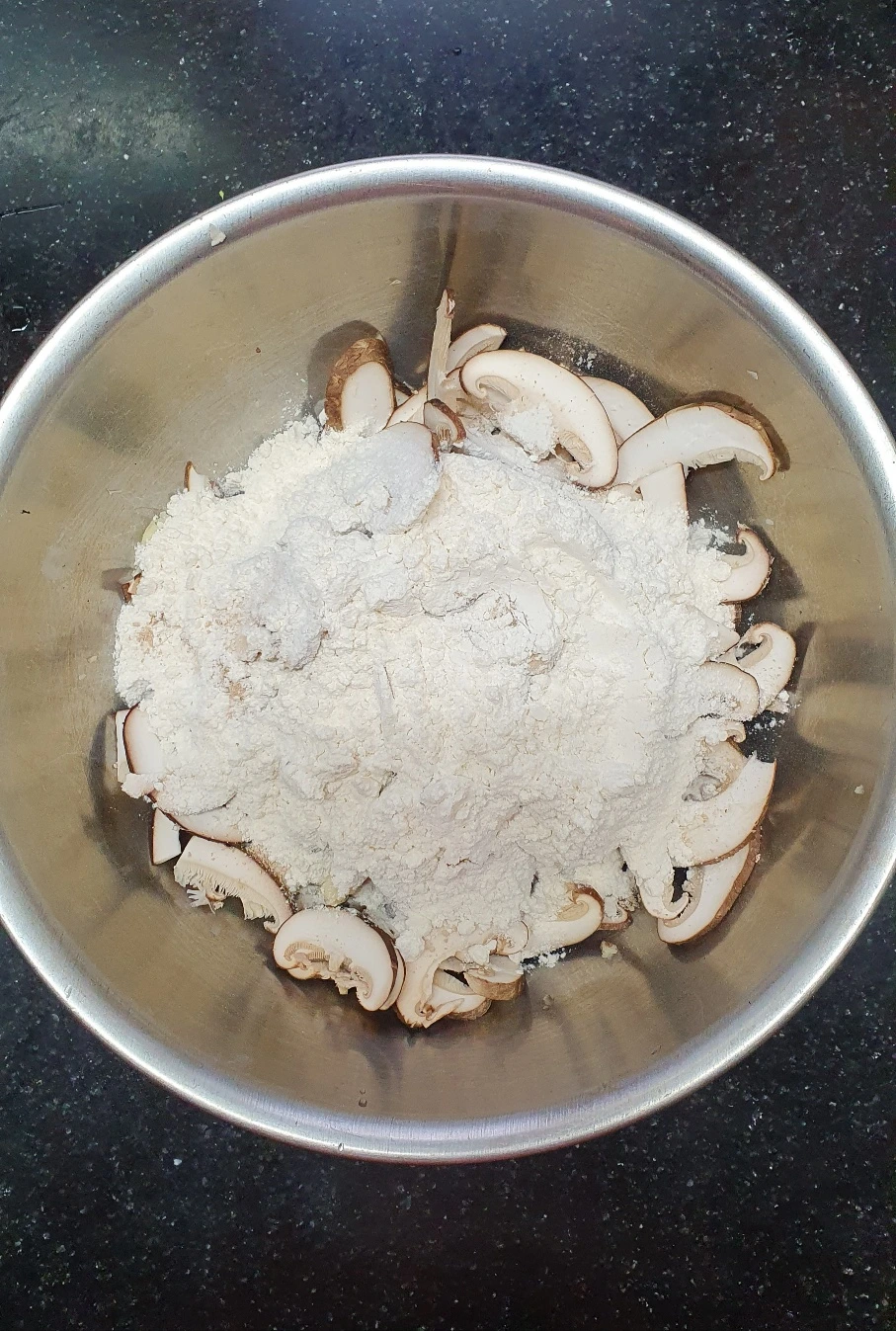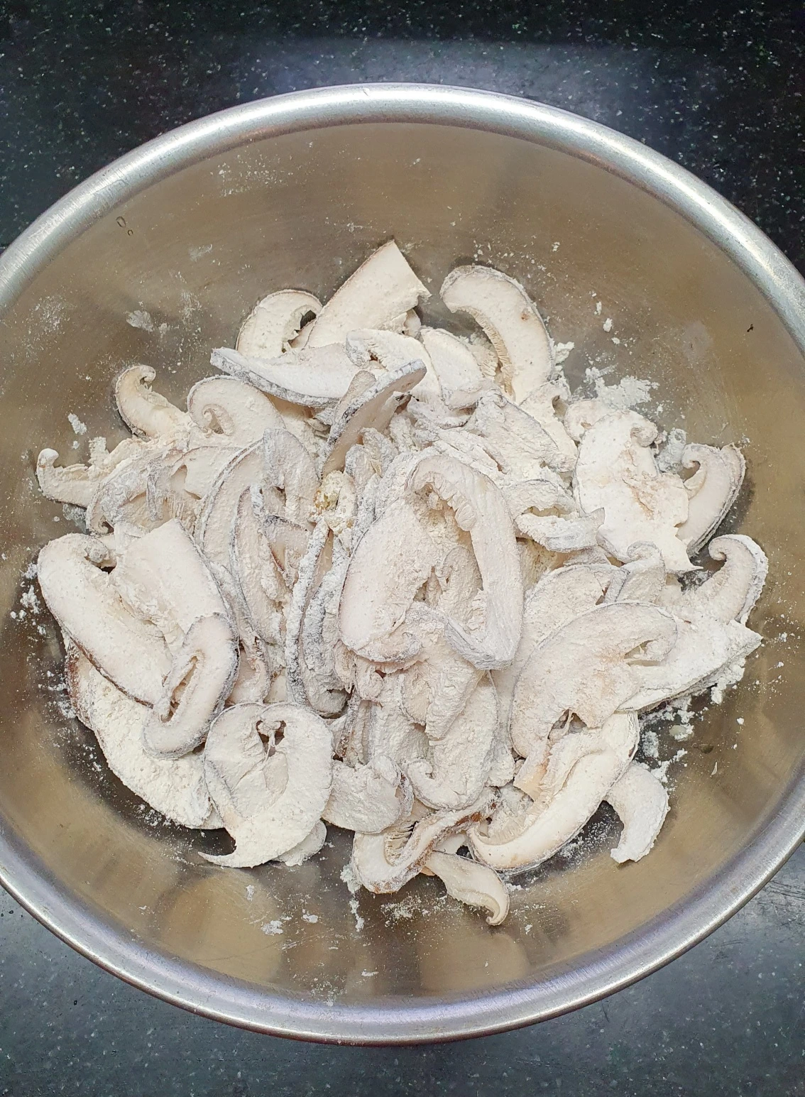 1. 슬라이스 한 표고버섯에 부침가루 넣고 반컵정도의 물을 첨가하고 되직하게 반죽해라