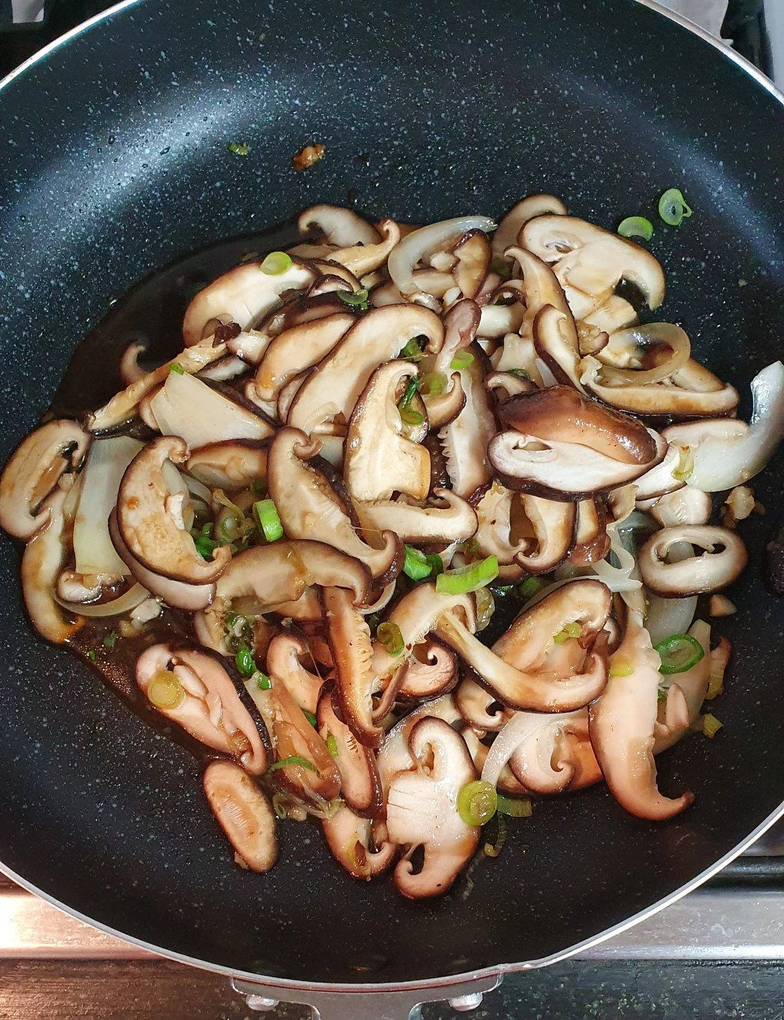 2. 양파 반 개와 대파반, 다진 마늘 반 스푼을 팬에 기름 한 스푼을 넣고 볶다가 향이 올라올 때 버섯 넣고 진간장 두 스푼 매실청, 올리고당 한 스푼씩 넣고 5분쯤 볶다가 굴소스 들기름 반 스푼 넣고 깨소금 팍팍 뿌려라