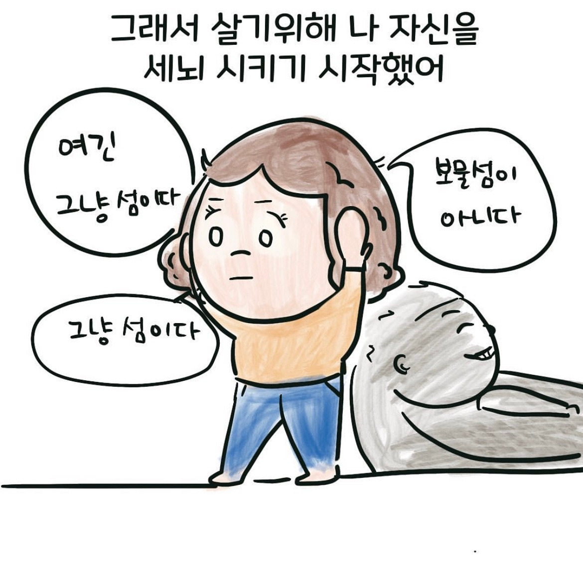 A. 물론, 우리만의 방법이 있다. 게을렀던 나와 남편이 자주 했던 행동이었고, 결국 옷들의 무덤 즉, 무한 증식의 섬을 만들기 시작했다. 문제는 매번 빨랫감을 찾기 위해 이 섬, 저 섬을 등정해야 했다는 점이었다. 결국, 남편과 나는 흩어져 있던 보물섬들을 한 군데에 모을 방법을 생각하는데....