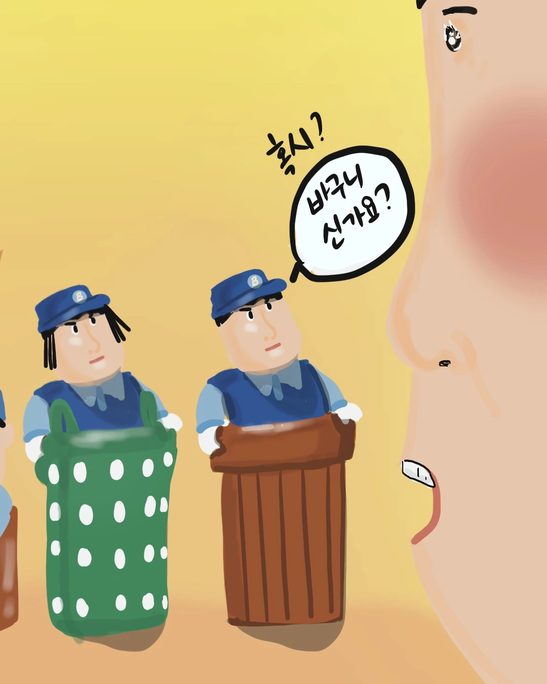 "바구니이? 우리 집에 얼마나 많은데 또 샀어? 현관 입구에는 분리해서 넣으라고 수건, 흰옷, 색깔 옷 바구니 있고, 여기에! 분리수거하는 바구니 3개 추가여, 또 쓰레기 통도 방 입구마다 놓아야 한다고 3개 더 샀잖아. 기억나니? 네가 말했지 이제 태민이의 무빙 댄스처럼 툭툭 던지는 삶을 살 수 있게 되었다고~ 이제 그만 산다며? 그런데 바구니를 또 사? 원통형도 아닌 바구니이~를?"