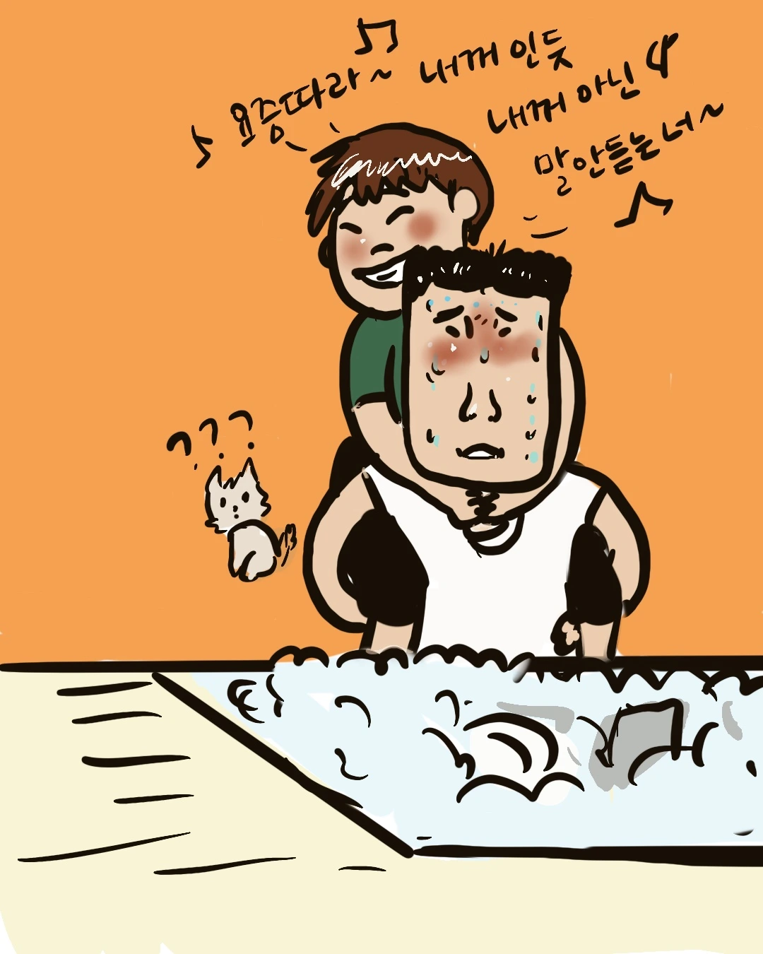그렇게 현란한 남편의 요리쇼가 끝나자 요리보다 무서운 산처럼 쌓인 설거지가 눈에 들어왔다. 그래서 슬금슬금 남편 모르게 조용히 안방으로 들어가서 문을 잠갔는데 이를 눈치챈 남편은 다급히 나를 부르기 시작했다.