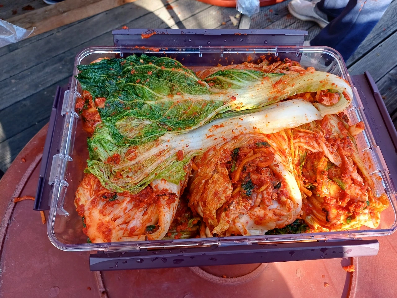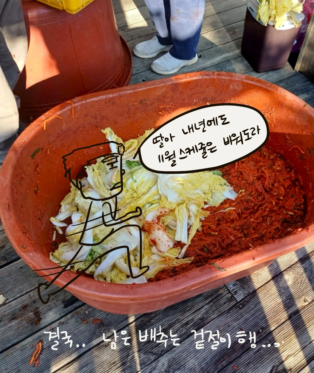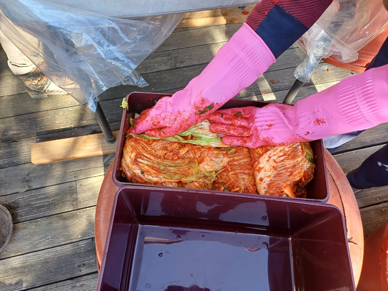 그렇게 아빠에게 어렵게 배운 교육으로 나는 나머지 배추에 양념 묻히고. 남편은 양념을 가득 바른 김장을 옮기며 서프라이즈 한 첫 김장을 마무리했다.