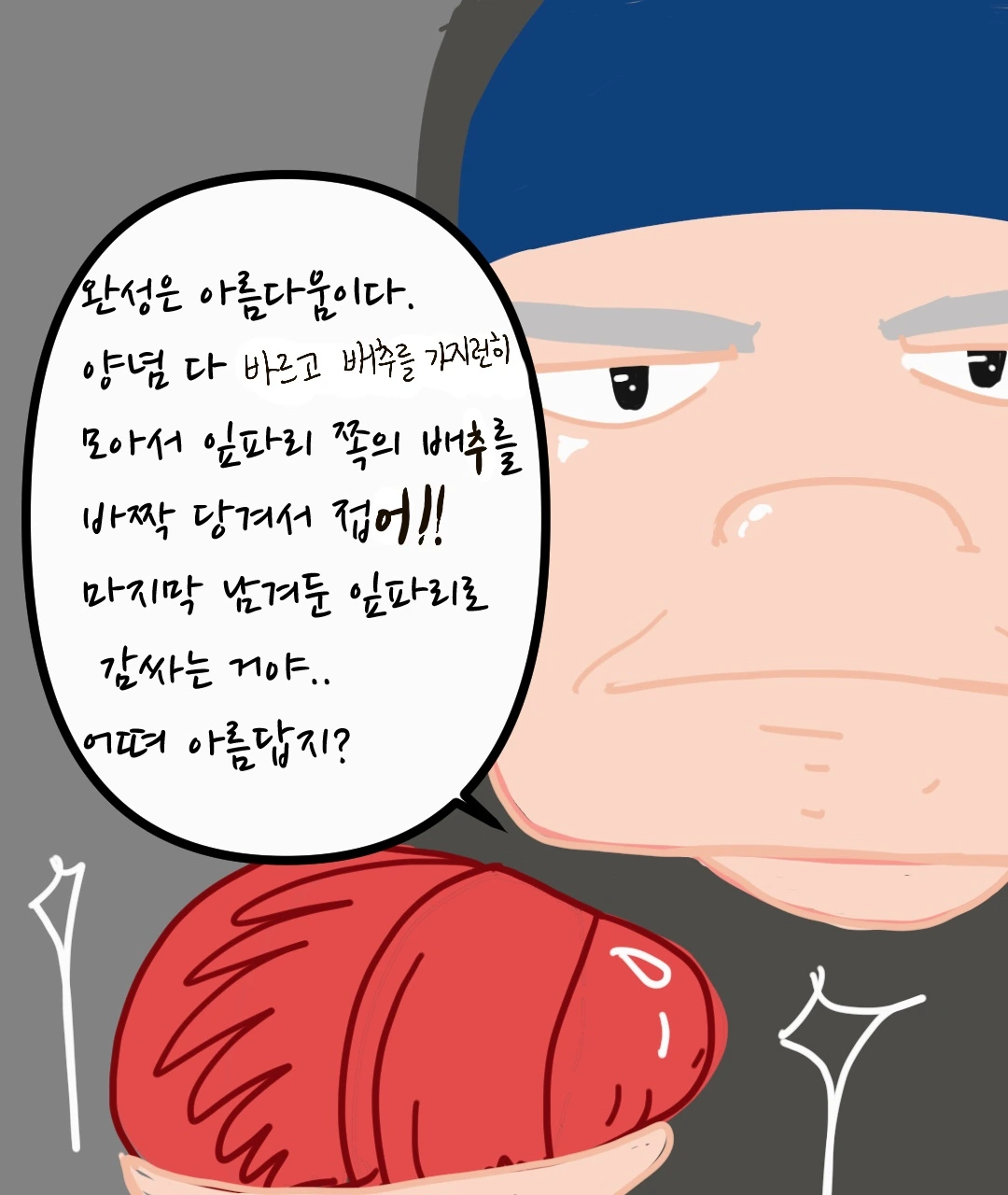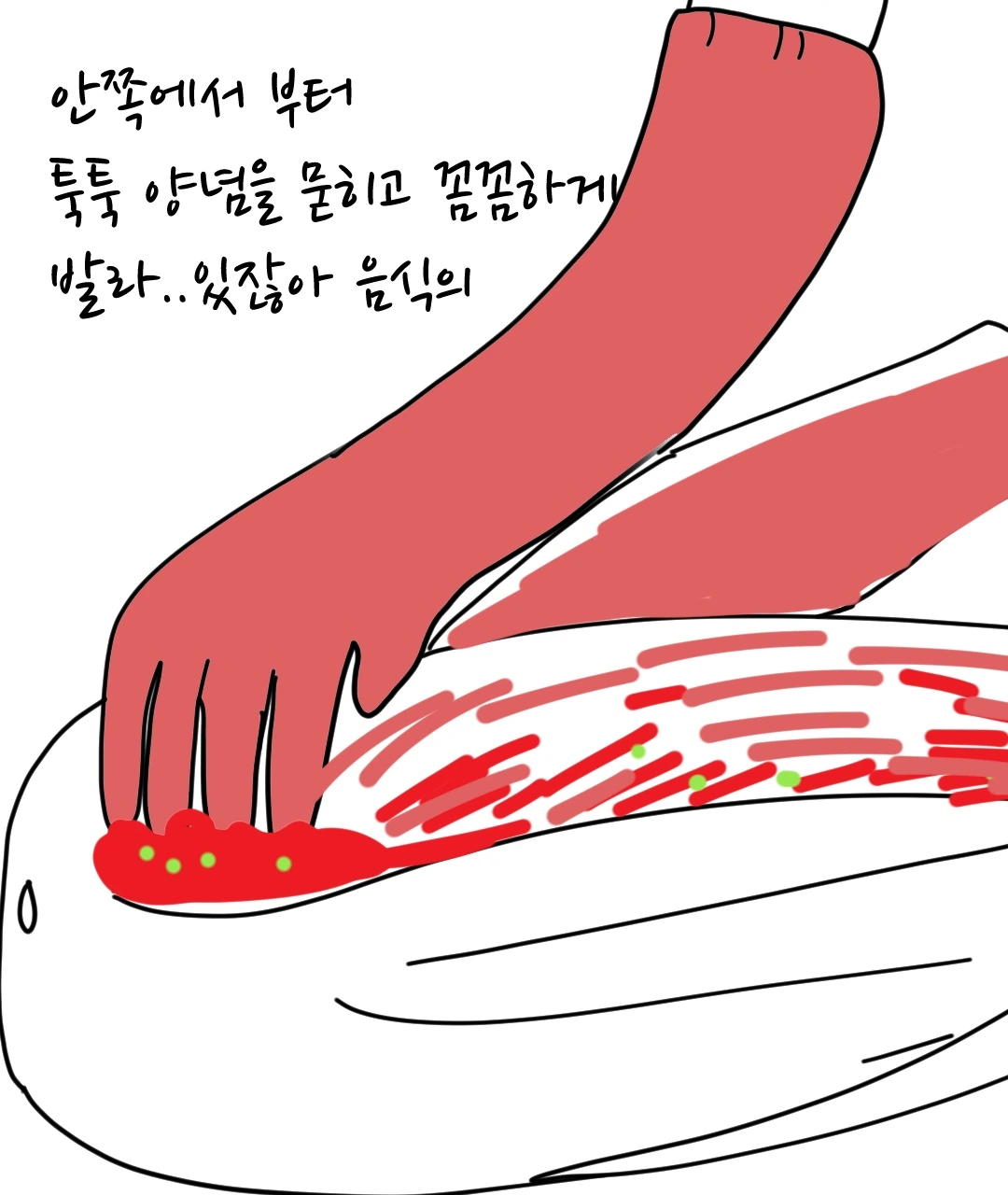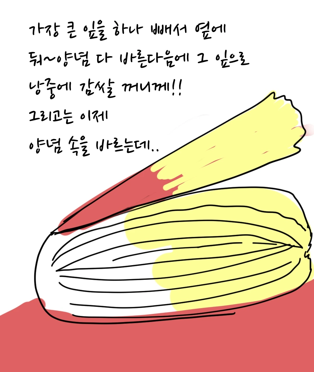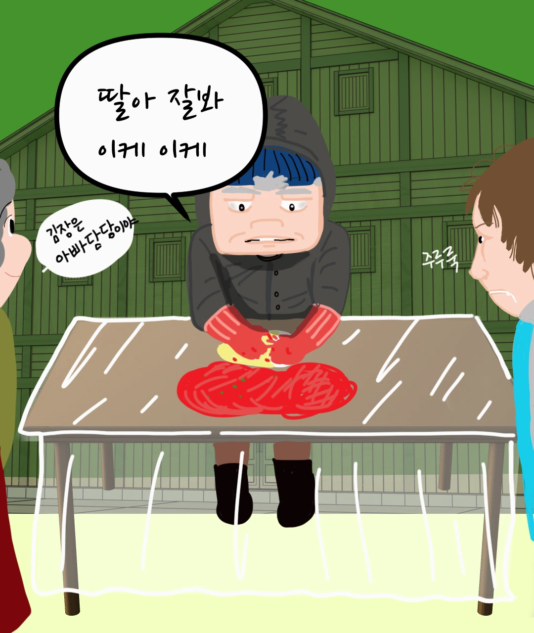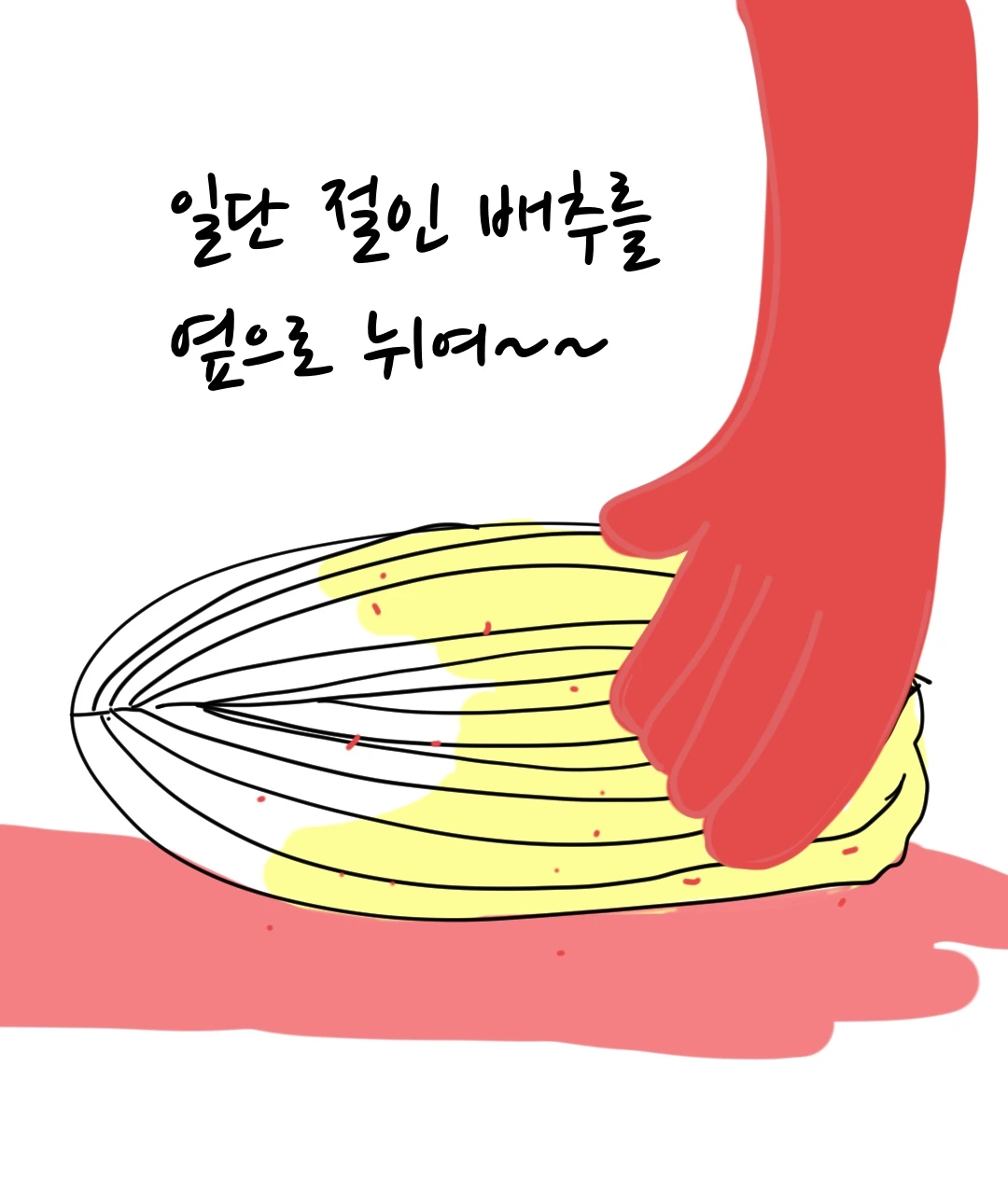 그렇게 난 피범벅 같은 김치 판에 억지 등판하게 되었다. 김장을 안 해봐서 어떻게 하는지 모른다고 잡힌 생선의 마지막 발버둥을 쳤지만, 엄마는 이미 그 모습을 예상했다는 듯이 비장하게 선생님을 소개했다.