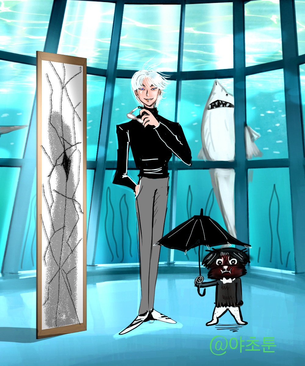 대표 사무실이라고 쓰여 있는 회색 문을 열자 파란색 불빛이 비추는 수족관이 정면으로 보였다. 그 수족관 안에는 수를 헤아릴 수 없는 상어들이 먹이를 깔깔깔깔 이상한 웃음소릴 내며 찾아다니며 헤엄치고 있었으며 그 속에 작은 형형색색의 물고기들이 그 상어들을 피하기 위해 열심히 헤엄치고 있었다.