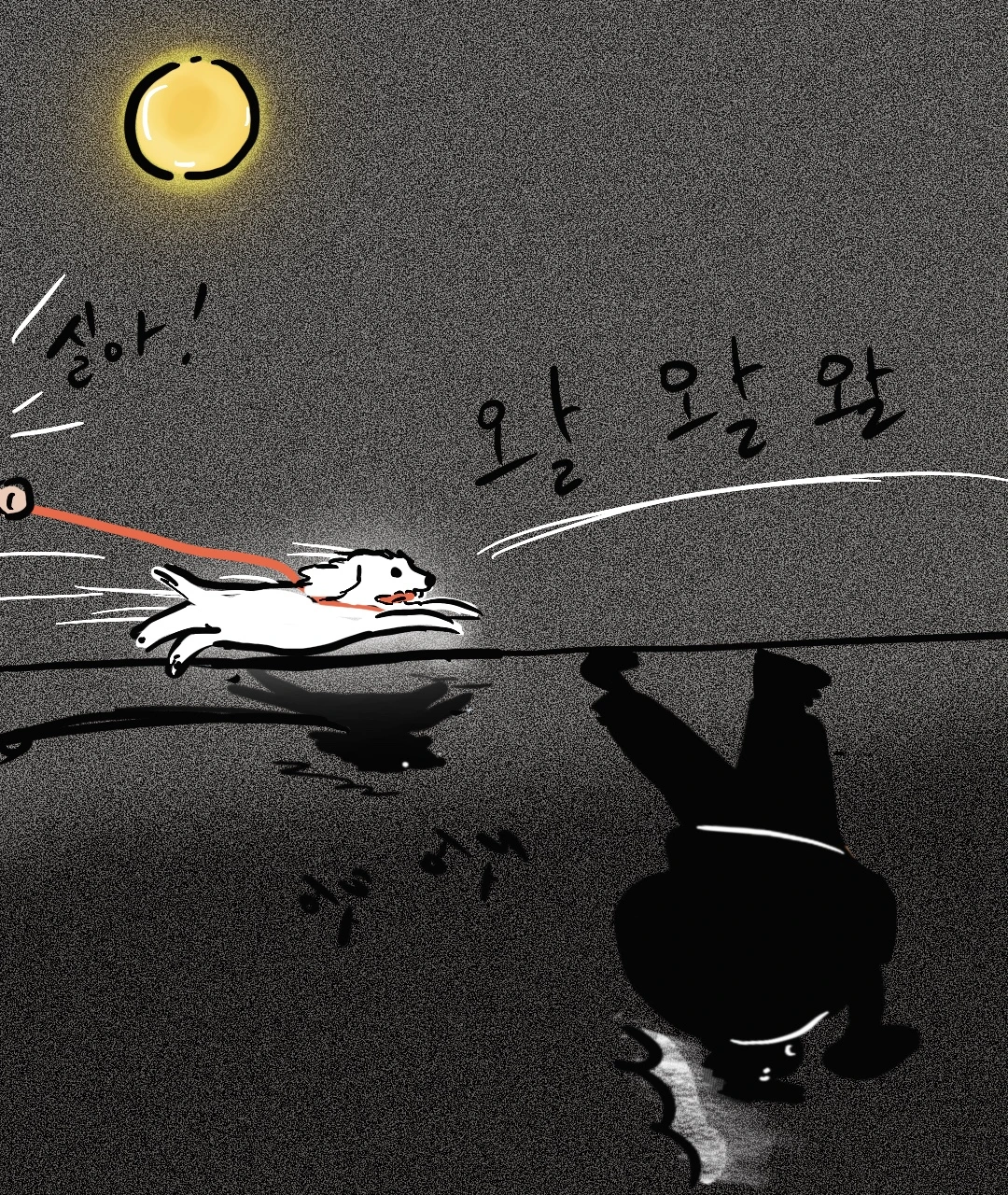 왈왈왈왈왈 짖는 실이의 소리가 그가 도망친 그림자라고 말하고 있었다. 짖으면서 다가오는 강아지의 모습에 흠칫 놀란 덩치 큰 검은색 그림자가 벤치에 앉아서 그들을 게슴츠레 쳐다보고 있었다. 마치 검은색 그림자는 늘과 실이가 자신의 곁에 오지 않았으면 좋겠다는 듯 불편해 보였지만. 인간 ”늘"은 날뛰는 실이의 발걸음에 어쩔 수 없이 자신도 모르게 그의 앞에 끌려왔다. 그리고 어색하게 주뼛주뼛 그 옆에 앉았다. 다행히 덩치 큰 검은색 그림자는 어차피 사람은 자신의 말을 못 듣는다는 듯이 혼잣말을 중얼거렸다.