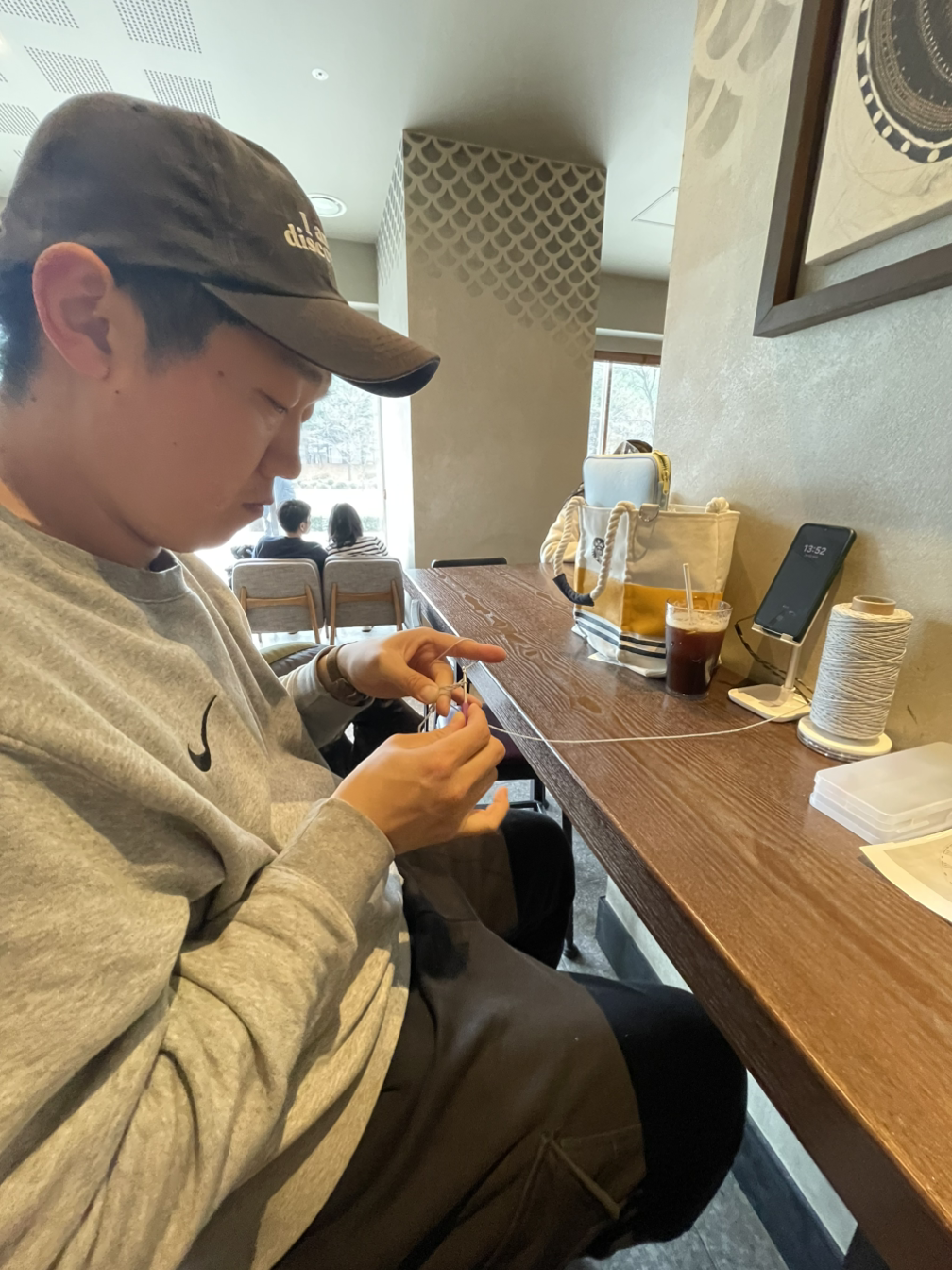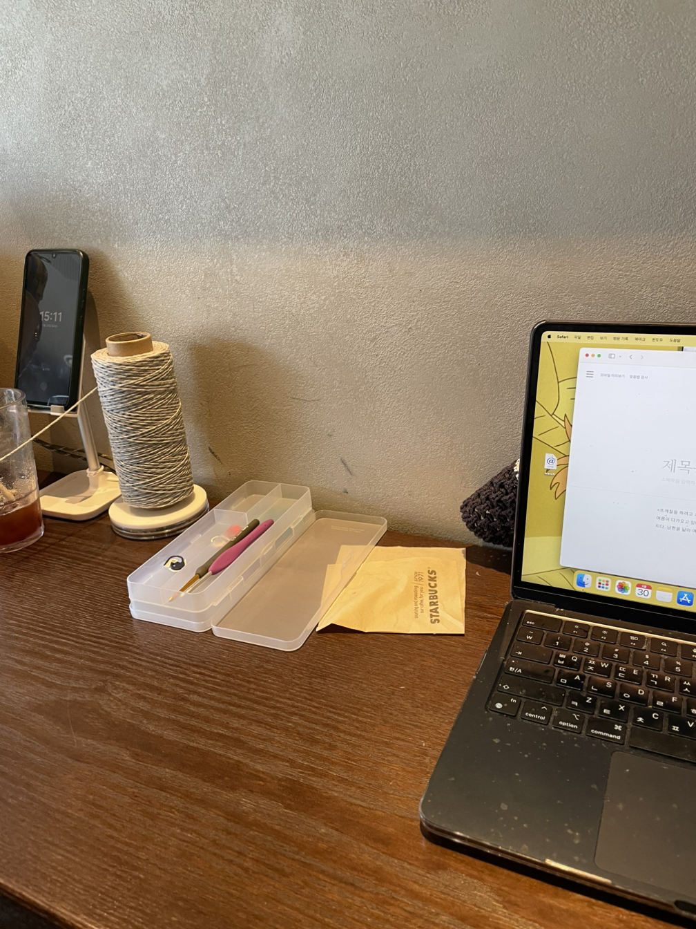 누가 그랬던가? 뜨개질은 실과 바늘만 있으면 된다고. 우리 남편은 뜨개질을 하기 위해서는 바늘과 실뿐만 아니라 더 많은 준비물이 필요했다. 타탁타탁. 카페에 자리를 잡은 남편은 자기가 가져온 것들을 테이블 위에 정리하기 시작했다.