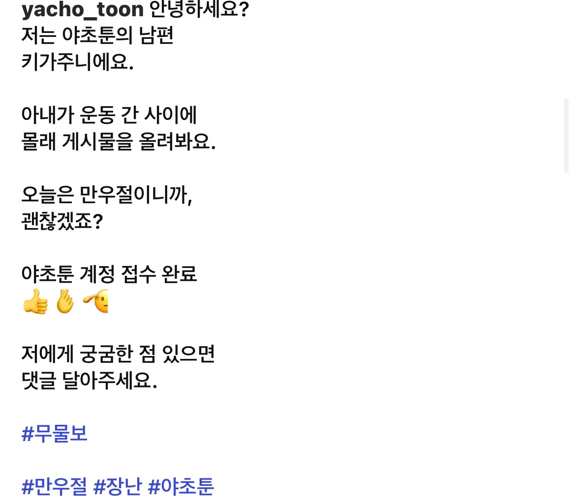 나는 그와 어쩔 수 없이 약속을 했지만, 그가 웃을 때마다 기분 나쁜 찝찝함을 떨쳐버릴 수가 없었다. 해시태그를 잘 쓰지도 못하면서, 그가 무물보라는 해시태그를 달기 위해서 얼마나 검색했을지 안 봐도 비디오였다.
