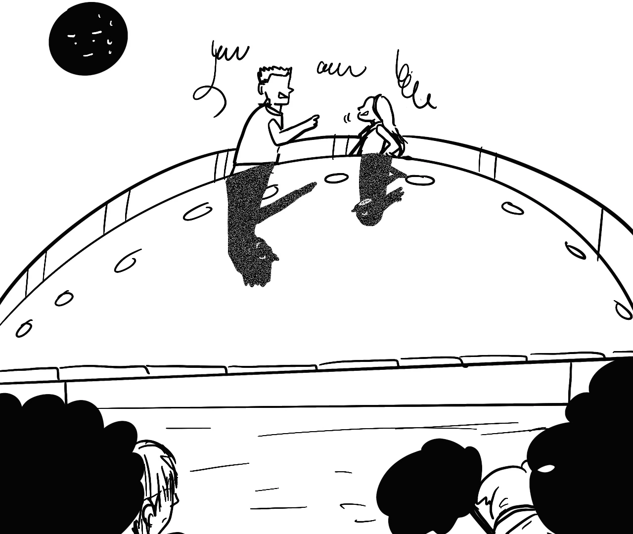 다리에는 인간 둘은 사라지고 9시가 되어 퇴근하는 그림자 둘이 서로를 껴앉고 기뻐하고 있었다.
