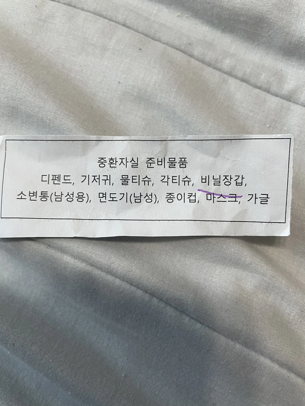 아, 그렇겠구나. 나에겐 만담처럼 느껴졌던 이 질문이 누군가를 살리기 위해서는 필요한 정보라니. 그래서 모든 질문에 땀을 삐질 흘리며 대답했다. 다행히 모든 절차가 다 끝났다고 말했다. 그들은 일어나려는 나에게 중환자실 물품이라는 종이를 나에게 건넸다.