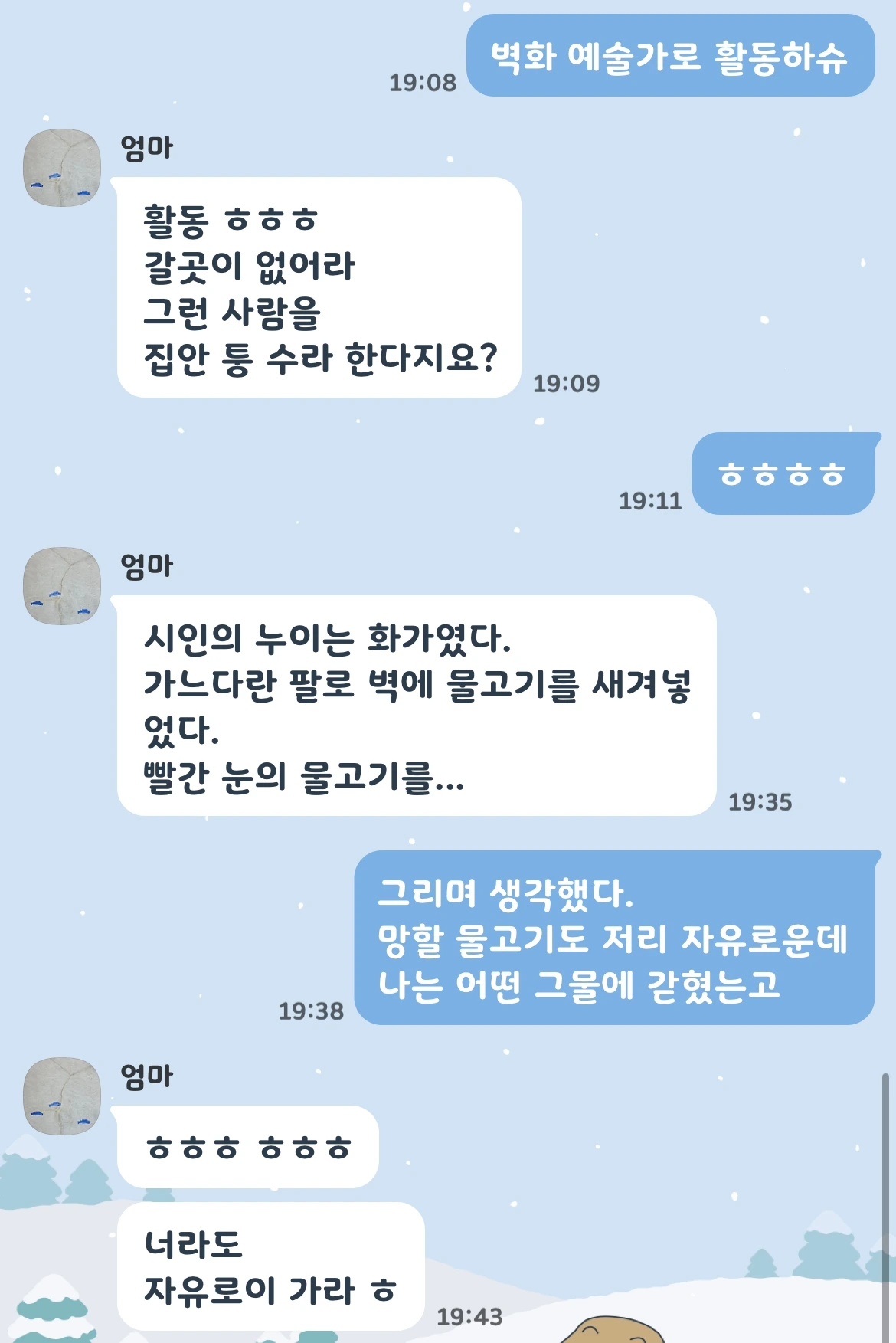 신기했다. 엄마가 그린 벽화가 엄마가 없던 소녀의 추운 겨울을 떠올리게 만들다니. 참 시렸겠다. 슬프기도 했겠지. 알 수 없는 감정이 나를 스쳐 지나간다. 하지만 이마저도 오래가지 못했다. 그런 내 마음을 또 귀신처럼 알아 차린 엄마는 벽에 그림을 그릴 생각에 처음으로 설레어 밤잠을 설쳤다고 메시지를 보낸다.