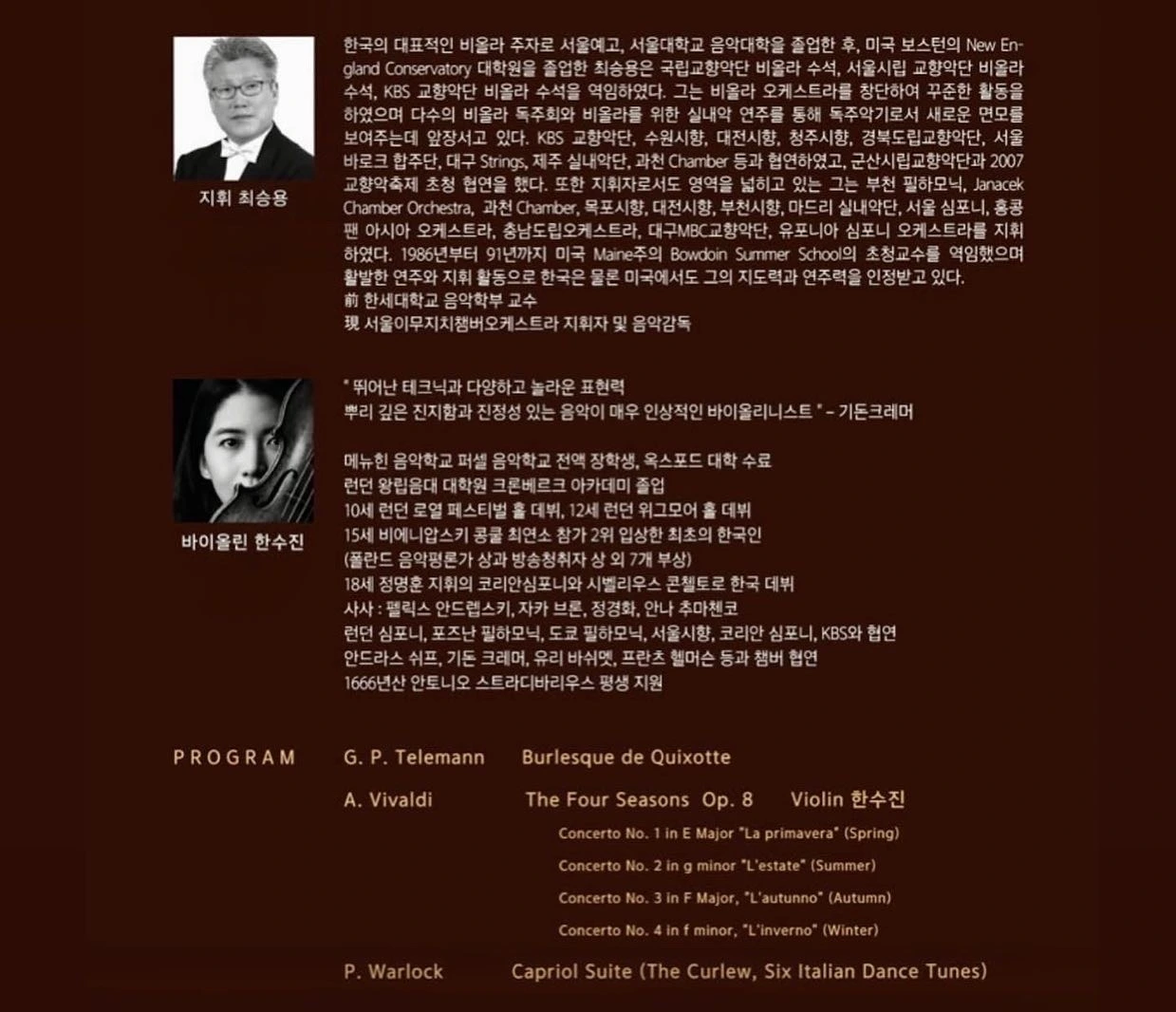 새계적인 바이올리니스트 한수진, 비올라 거장 최승용 지휘의 비발디 사계