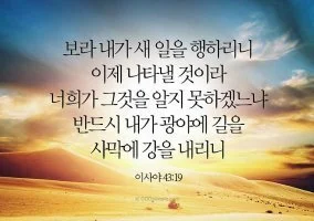 15.나는 여호와 너희의 거룩한 이요 이스라엘의 창조자요 너희의 왕이니라 /16.나 여호와가 이같이 말하노라 바다 가운데에 길을, 큰 물 가운데에 지름길을 내고 /17.병거와 말과 군대의 용사를 이끌어 내어 그들이 일시에 엎드러져 일어나지 못하고 소멸하기를 꺼져가는 등불 같게 하였느니라 /18.너희는 이전 일을 기억하지 말며 옛날 일을 생각하지 말라 /19.보라 내가 새 일을 행하리니 이제 나타낼 것이라 너희가 그것을 알지 못하겠느냐 반드시 내가 광야에 길을 사막에 강을 내리니 (사43:15~19)