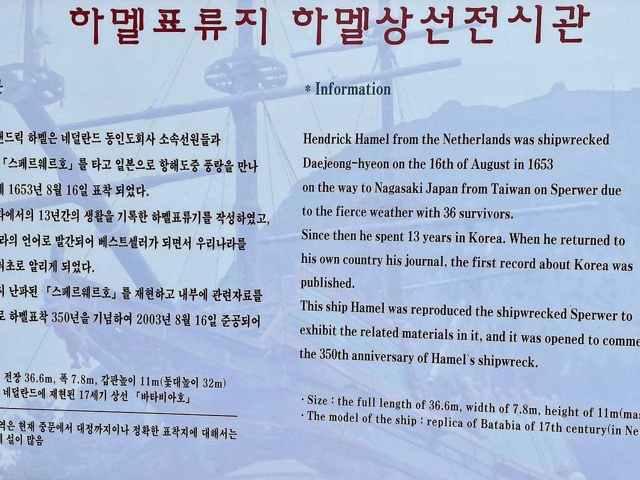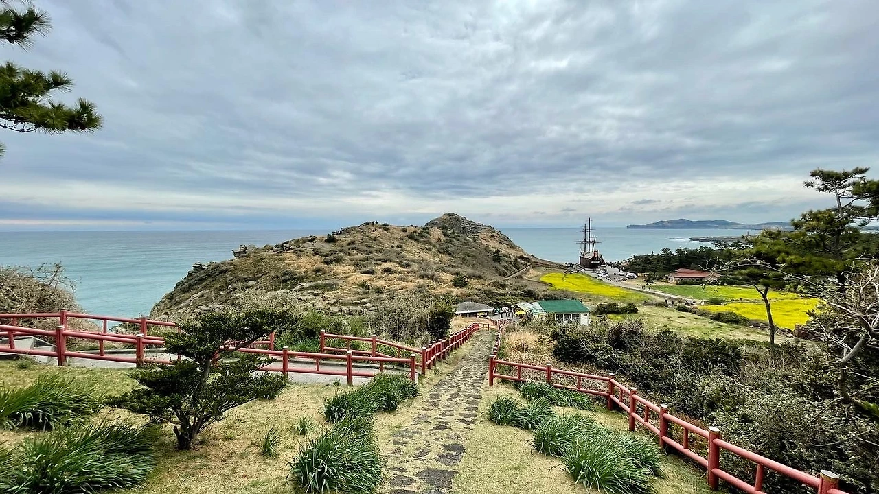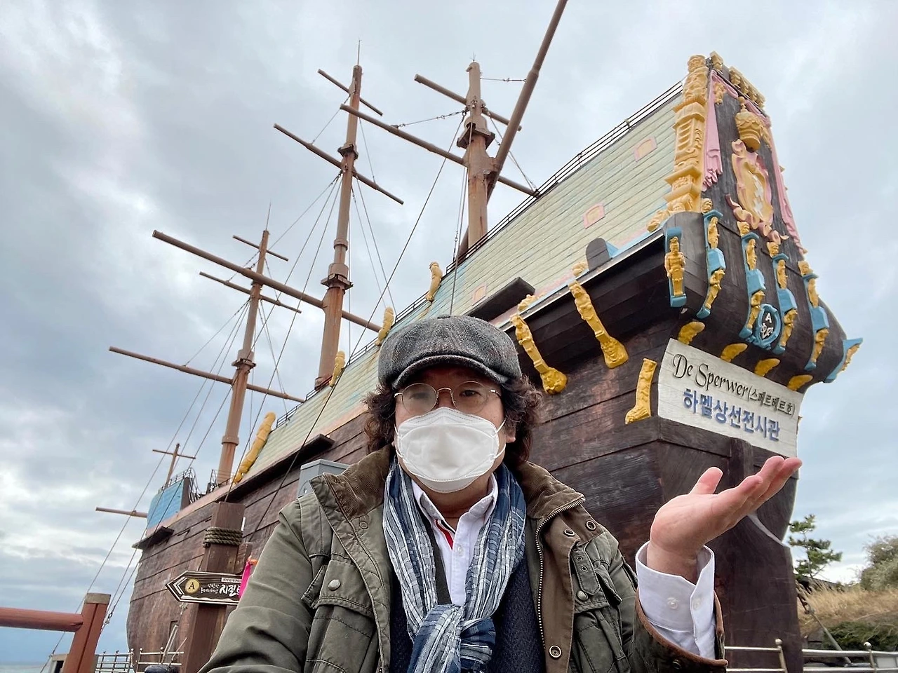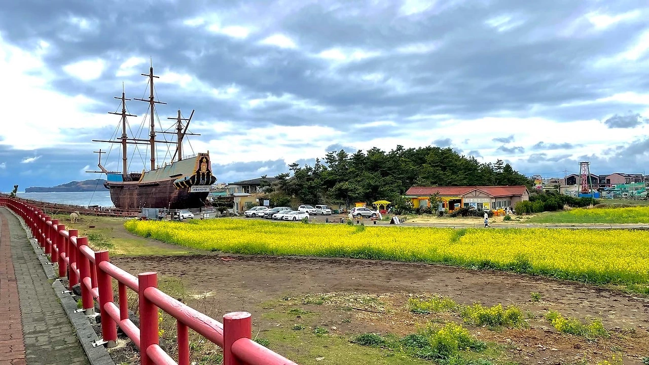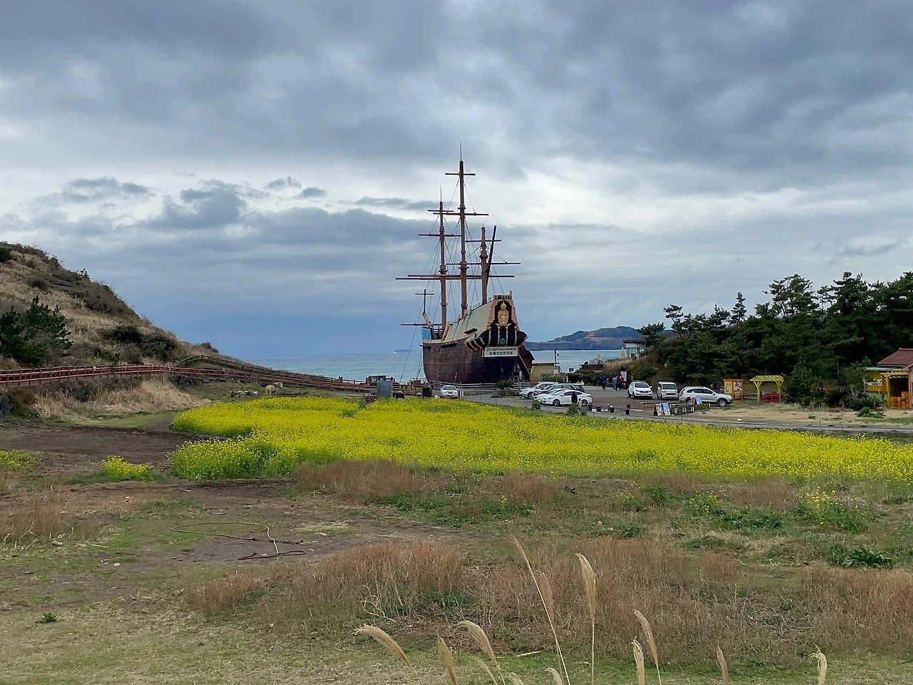 그런데 오던 봄비가 그치고 신기하게도 햇살이 수줍은 인사를 하는 것이 아닌가?! 역시 하나님은 나를 너무나 사랑하신다! 유채꽃밭에 도착하자마자 연신 셀카로 유채꽃에 비할 내 얼굴은 아니지만 자신감을 갖고 사진을 찍어댔다. 유채꽃밭에서 바지에 흙이 묻어나는 것도 모르고 비온 뒤 물러진 흙 위에서 행복하게 사진을 여러 장 찍은 후 바로 옆쪽에 보문사라는 절에 가서 멋진 광경을 담고 소원을 비는 종도 쳐 보았다 보문사를 둘러본 후 아래쪽에 보이는 정박해 있는 배 쪽으로 걸어내려갔다. 그 정박해 있던 배는 네덜란드 상선인 하멜상선이었다. 진짜 하멜이 그 당시 타고왔던 상선은 아니고 뒤에 모형으로 벅원되어진것 같다. 네덜란드에서 일본에 배를 타고 가다 제주도에 좌초되었던 하멜! 그리고 그의 상선이 옛날 읽었던 하멜표류기를 다시 생각나게 했다! 하멜상선 모령선이 있는 곳으로 내려가다 한가롭게 쉬고 있는 말들을 보며 나도 평화로움을 느낄 즘 강하게 불어오는 해풍에 모자가 날아갈뻔하였다. 내려가는 길에 유명하다는 해물라면 식당을 지나치고 선물가게에서 기념품을 보고 계속 배가 있는 쪽을 항해 걸음을 옮겼다. 제주는 말, 바람 여자가 많다 하여 삼다도라 하였음이 확실히 이해되어졌다. 드디어 하멜의 모형선 근처에 도착했다. 그 당시 상선을 복원하여 만든 모형이지만 그 웅장함이 어느 정도 였을찌 가늠이 되었다.